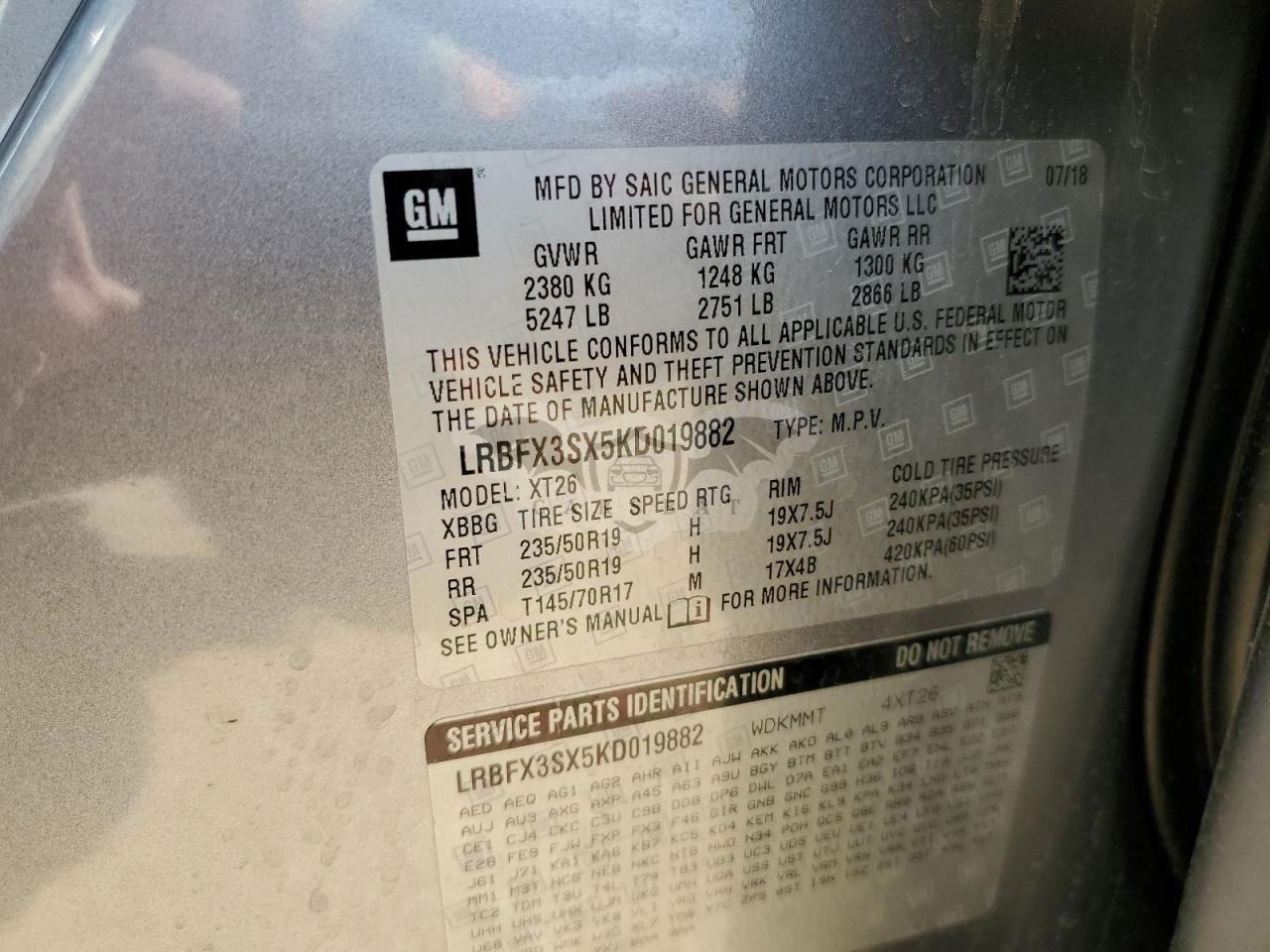 • VIN: LRBFX3SX5KD019882