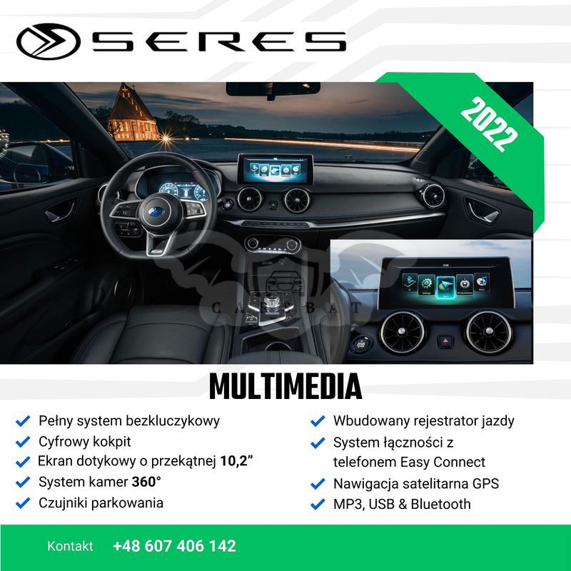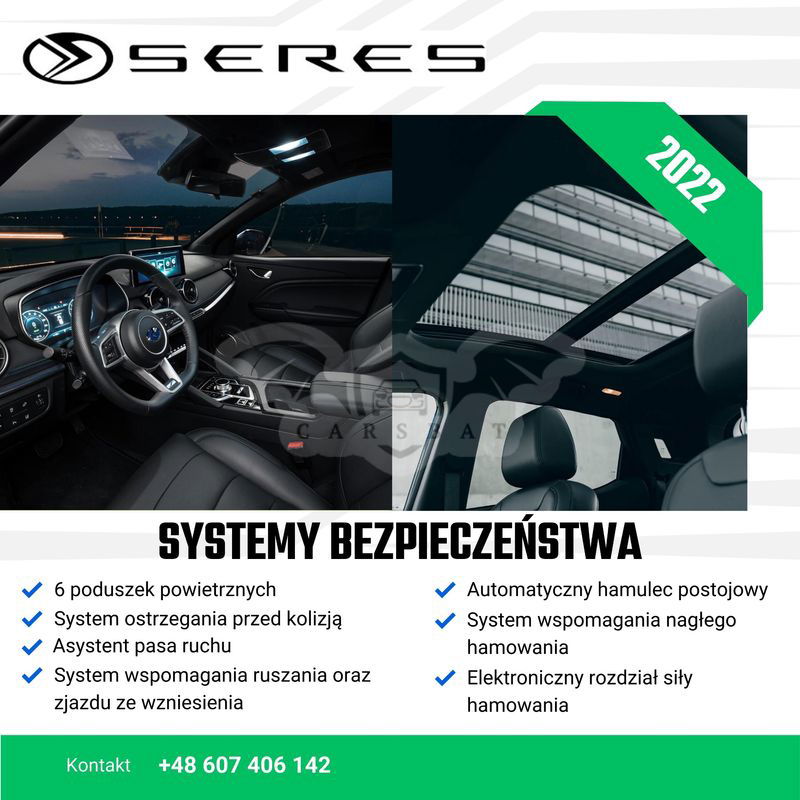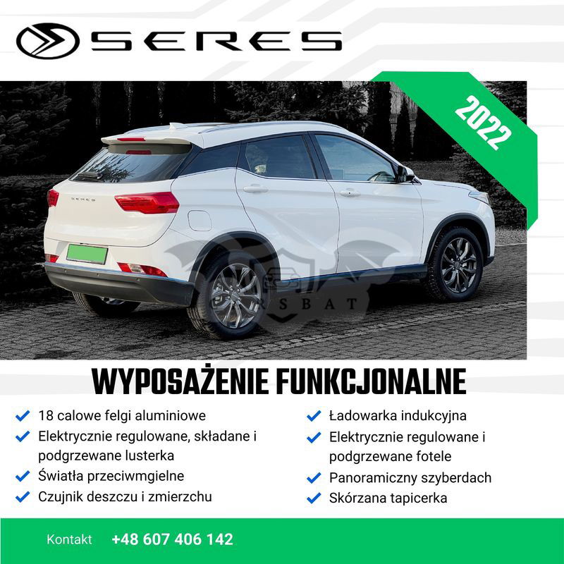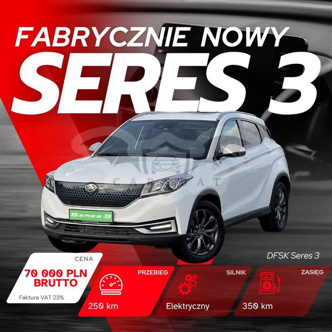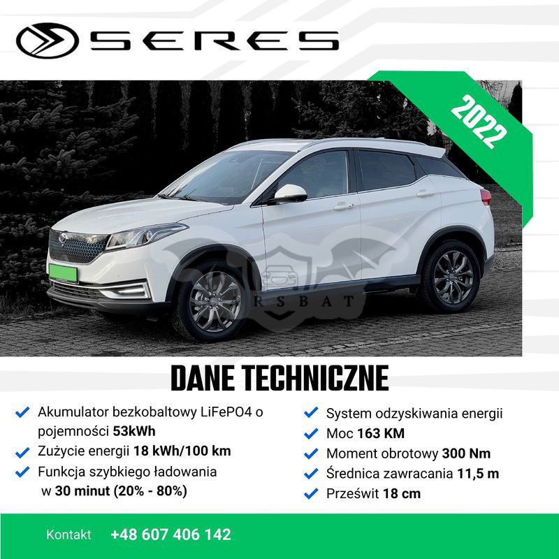 Na sprzedaż fabrycznie NOWY, ELEKTRYCZNY Seres 3 z przebiegiem 250 km. Kraj pochodzenia: POLSKA Bateria: 53kWh Zasięg: 350km Moc: 163KM i 300Nm Wersja: Luxury Seres 3 jest miejskim SUVem o długości 4,4m, 165 cm wysokości i prześwitem 18 cm. Silnik generuje moc 163KM i 300Nm, moc przekazywana jest na koła przednie a do wyboru mamy trzy tryby jazdy, które bardzo zmieniają ilość dostępnej mocy. Seres 3 to przestronne auto wyposażone w 6 poduszek powietrznych, wbudowany wideorejestrator, cyfrowe zegary, system wspomagania hamowania, system wspomagania ruszania na wzniesieniu, asystenta pasa ruchu, elektrycznie regulowane, składane i podgrzewane lusterka, elektryczne fotele przednie, system multimedialny z ponad 10-cio calowym wyświetlaczem, bezkluczykowy system dostępu, automatyczną klimatyzację, kamery 360 stopni, czujniki parkowania, podgrzewane fotele, ładowarkę indukcyjną, tempomat, dach panoramiczny, 18 calowe felgi aluminiowe, LEDowe światła do jazdy dziennej i dużo więcej. Seres 3 to bardzo ciekawe, świetnie doposażone auto, które może być idealną opcją rozpoczęcia przygody z samochodami elektrycznymi. Samochód z pełną fakturą VAT. Możliwość zamiany na inne auto , cena w ogłoszeniu jest ceną BRUTTO. Zapraszam do kontaktu i obejrzenia samochodu na żywo. Tel.