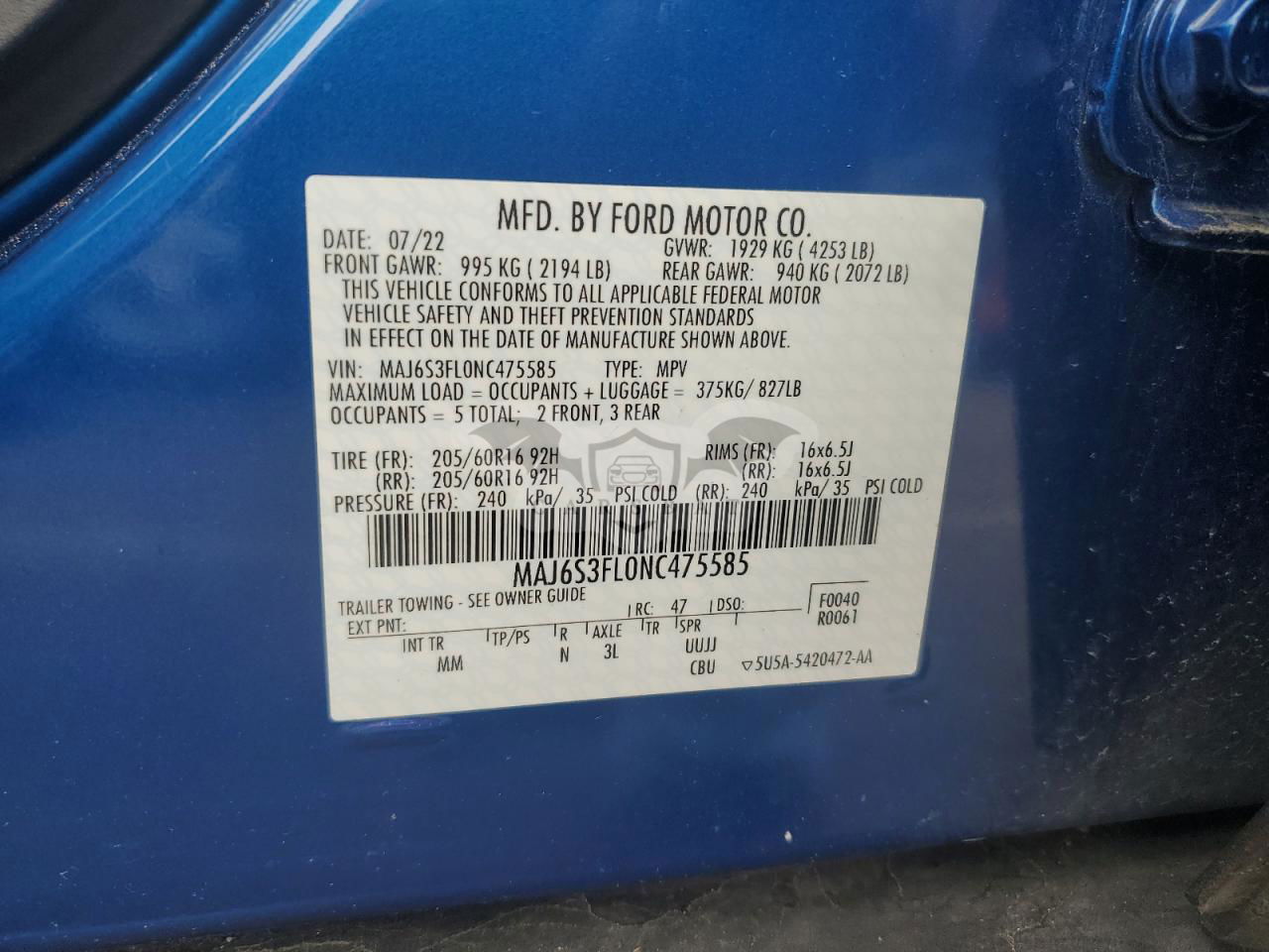 • VIN: MAJ6S3FL0NC475585