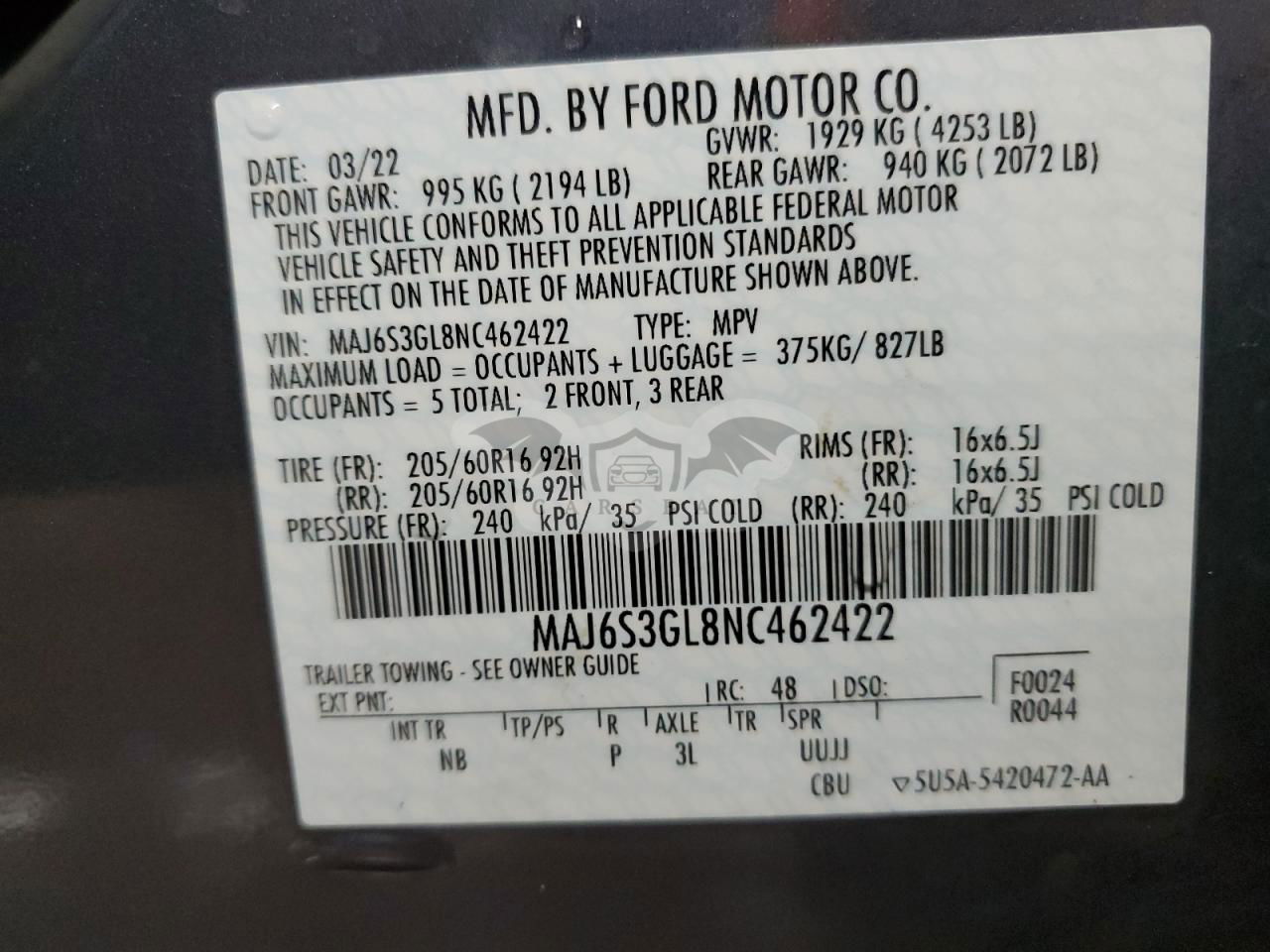 • VIN: MAJ6S3GL8NC462422