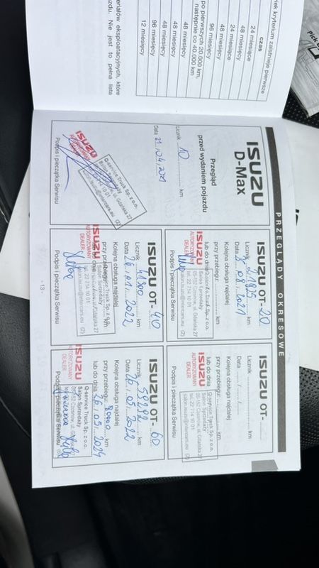 Witam, Na sprzedaż firmowe auto ISUZU D-MAX w najwyżej możliwej wersji LSE. Kolor biała perła z czarnymi dodatkami. Auto ma dołożone orurowanie przód, owiewki, stopnie i zabudowę HARD TOP z otwieranymi szklanymi szybami, oświetleniem i grzaną tylną szybą. Pojazd kupiony w salonie ISUZU w Czosnowie. Samochód z roku 2020, przebieg 115 000 i ciągle rośnie. Silnik 1.9 diesel. Pojazd od nowości serwisowany w salonie Isuzu, wszystkie serwisy i naprawy wykonywane w terminie. Auto w pełni sprawne, nie wymaga żadnego nakładu finansowego. Najwyższe możliwe wyposażenie w wersji LSE: - automat 6cio biegowy (po wymianie oleju) - napęd: 4x4 dołączany ręcznie + blokada mostu, tryby jazdy 2H, 4H, 4L z reduktorem, 4L z blokadą i reduktorem, - reflektory przednie BI- LED z automatycznym poziomowaniem - światła w pełni automatyczne, - stacja multimedialna z 9 calowym ekranem (Apple car play, android auto) + 8 głośników Surrand System, - szerokokątna kamera cofania z funkcją wyłapywania ruchu poprzecznego, - skórzana czarna tapicerka w idealnym stanie z czarna podsufitką i czarnymi elementami wykończenia, - wielofunkcyjna kierownica, - elektrycznie regulowany fotel kierowcy, - automatyczna klimatyzacja - dwustrefowa, - felgi oryginalne 18stki - piękne, ani jednego zadrapania, proste, wyważone, - opony lato + zima, - system bezkluczykowy (Key less), - pełno wymiarowe koło zapasowe, - orurowanie zderzaka przedniego, - czujniki parkowania przód / tył, - wszystkie możliwe dostępne w tej wersji systemy bezpieczeństwa i wspomagania. - 19.08.2022 - montaż fabrycznie nowego silnika z oprzyrządowaniem - silnik wymieniony na gwarancji w związku z awarią DPFa. Aktualny przebieg silnika to 65 000 km / gwarancja na silnik do 100 tys km. - od spodu stalowe osłony silnika / oryginalne montowane w salonie. - zamontowany oryginalny hak, udźwig 3500 kg Duży, fajny, solidny i super wyglądający pick-up. Bardzo zadbany i na bieżąco serwisowany. Maksymalnie wyposażony i jeżdżony głównie po autostradach. Cena 142 000 złotych BRUTTO / sprzedaż na fv 23 %. Auto do obejrzenia po wcześniejszym umówieniu się w Warszawie. Możliwość sprzedaży do służb mundurowych. Za dodatkową opłatą zamontujemy oświetlenie ostrzegawczo dźwiękowe, radiostacje, oklejenie pojazdu. Cena podlega dosłownie symbolicznej negocjacji.