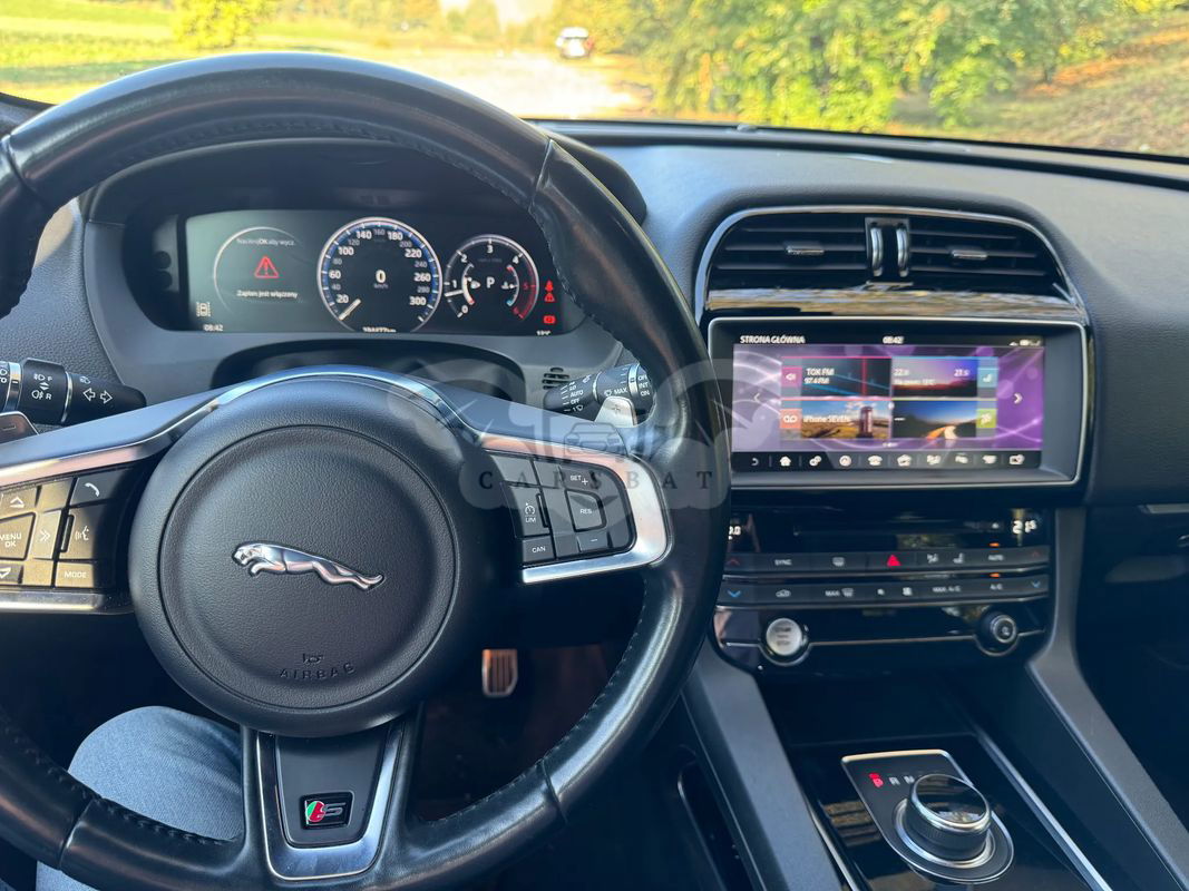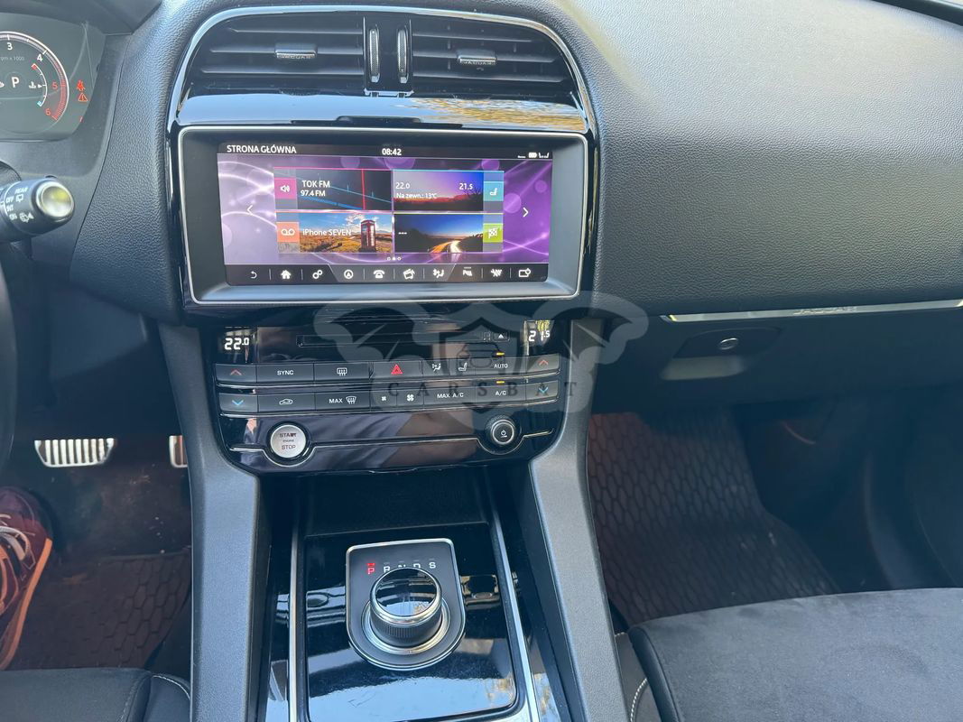 Wyposażenie: System nagłaśniający Meridian™, złącze USB, Mapy na dysku SSD, ekran dotykowy 10", odtwarzacz CD/DVD, Dodatkowe złącze USB zastępujące AUX-In, Cyfrowy wyświetlacz zegarów 12,3". System łączności bezprzewodowej Bluetooth®. 5 gniazdek (3x 12V i 2x USB) 12V umiejscowione jak D72A, USB x 2 dla drugiego rzędu siedzeń. Dwustrefowa automatyczna klimatyzacja. Czujniki parkowania przód, tył + System monitorowania ciśnienia w oponach. Autonomiczny system awaryjnego hamowania. Tempomat z inteligentnym ogranicznikiem prędkości. System ostrzegający o opuszczeniu pasa ruchu. Lusterka zewnętrzne - elektrycznie regulowane, podgrzewane, składane z lampami doświetlającymi podłoże z logiem JAGUAR (robią niesamowite wrażenie) i wbudowanymi kierunkowskazami. Pełne koło zapasowe z oryginalną 22’’ felgą (w przypadku złapania gumy, wymieniasz i jedziesz dalej, bez szukania warsztatu lub lawety) Przednie lampy przeciwmgielne. Lampy obrysowe Led. Automatyczne wycieraczki szyby przedniej z czujnikiem deszczu (zawarte automatyczne włączanie świateł mijania). Podłokietnik z tyłu z 2 miejscami na kubki. Kierownica wykończona skórą. I wiele innych..