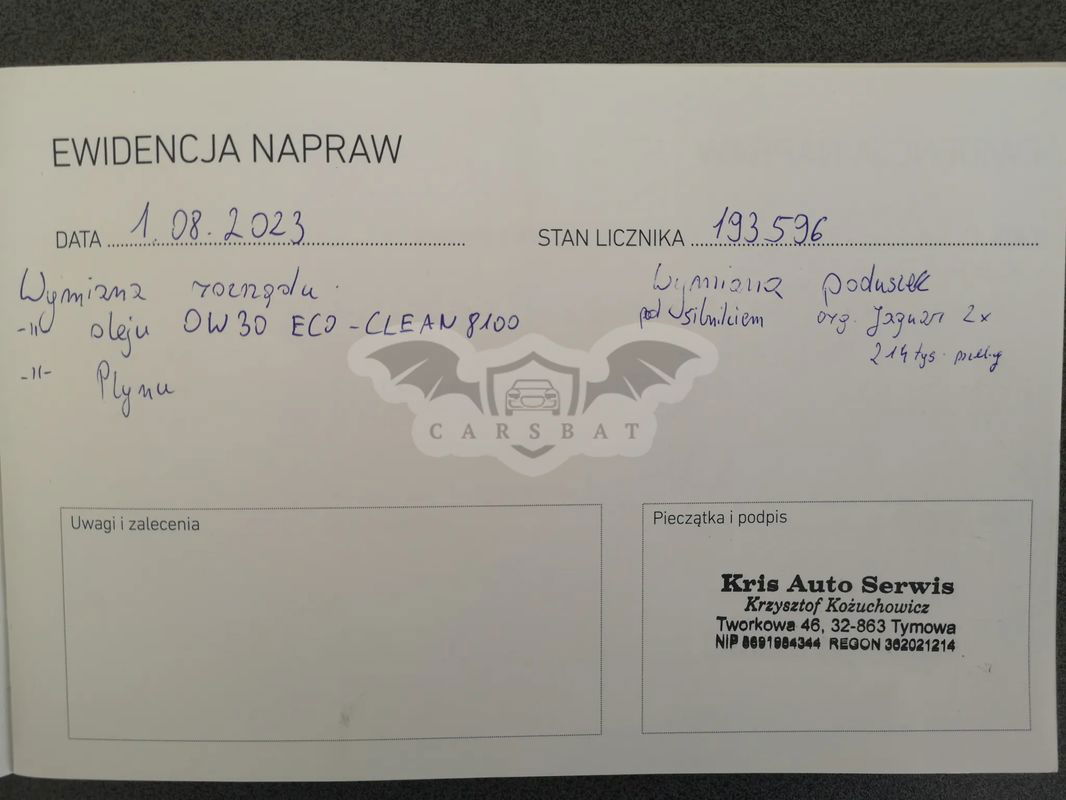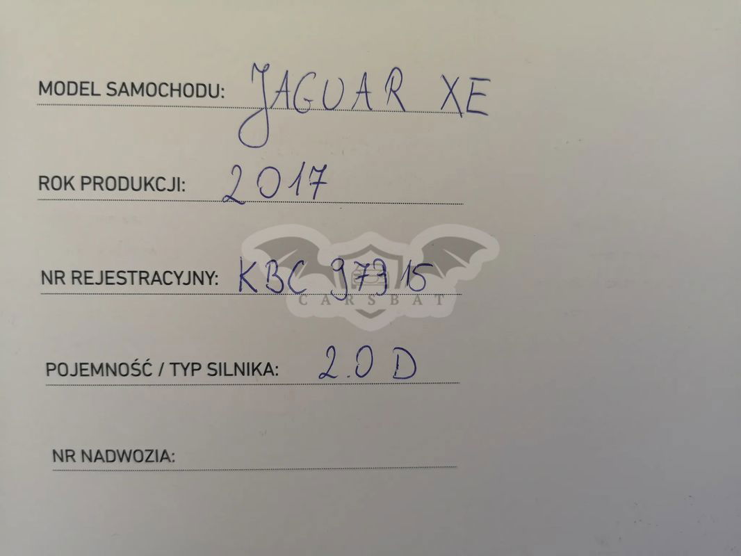 MARKA/MODEL: JAGUAR XE 2,0 d AUTOMAT R-SPORT POJEMNOŚĆ/MOC: 1 9 9 9 ccm – 1 8 0 kM PRODUKCJA: 2 0 1 7 r. II WŁAŚCICIEL POJAZDU W KRAJU OD: 2 0 2 3 . 0 . 2 3 - IMPORT z NIEMIEC DOKUMENTY POCHODZENIA, HISTORIA SERWISOWA PRZEBIEG AUTENTYCZNY: 2 2 9 . 9 4 0 km WYPOSAŻENIE: DWUSTREFOWY C L I M A T R O N I C "AIR BAG" x 8: PODUSZKI + KURTYNY POWIETRZNE SKÓRZANA TAPICERKA APLIKACJE "BLACK PIANO" SYSTEMY:"ABS+ESP", KAMERA+PARKTRONIKI P/TYŁ ELEKTRYCZNIE STEROWANE 4 -SZYBY + LUSTERKA SKŁADANE/PODGRZEWANE, TRYBY JAZDY: DYNAMIC STANDARD/ECO/ZIMOWY, SPORTOWE ZAWIESZENIE KOMPUTER POKŁADOWY, WSPOMAGANIE UKŁADU KIEROWNICZEGO, CENTRALNY ZAMEK STEROWANY ELEKTRONICZNYM KLUCZYKIEM, ENGINE STOP&GO RADIOODTWARZACZ MP3,2xUSB,HDMI"MERIDIAN" NAWIGACJA SATELITARNA, BLUETOOTH AUDIO/TEL. KOMENDY GŁOSEM, DOTYKOWY MONITOR, PL MENU ELEKTRYCZNA REGULACJA KOLUMNY KIEROWNICY REFLEKTORY/ŚWIATŁA DZIENNE"LED", TUNEL NA NARTY, CENTRALNY ZAMEK,IMMOBILIZER, LAKIER METALIC , ELEKTRYCZNIE REGULOWANE FOTELE PODGRZEWANE, TEMPOMAT+ASPC, LIMITER, ASYST PASA RUCHU, AKTYWNE HAMOWANIE, ALU-FELGI 19" Z OPONAMI NA ZIMĘ, DODATKOWE OPONY NA LATO SFERYCZNE LUSTERKO, SENSOR DESZCZU+ŚWIATEŁ EKONOMIZER, SKŁADANE DZIELONE TYLNE FOTELE ISOFIX, WIELOFUNKCYJNA SKÓRZANA KIEROWNICA PODGRZEWANA Z MANETKAMI DO ZMIANY BIEGÓW KATALIZATOR, AUTOMATYCZNA SKRZYNIA BIEGÓW BEZWYPADKOWY, LAKIER ORYGINALNY, STAN BDB ŚREDNIE ZUŻYCIE PALIWA: 6 litrów ON / 100 km CENA: 6 5 . 9 0 0 PLN SZEŚĆDZIESIĄT PIĘĆ TYSIĘCY DZIEWIĘĆSET PLN CENA ZAWIERA PODATEK OD CZYNNOŚCI CYWILNO-PRAWNYCH
