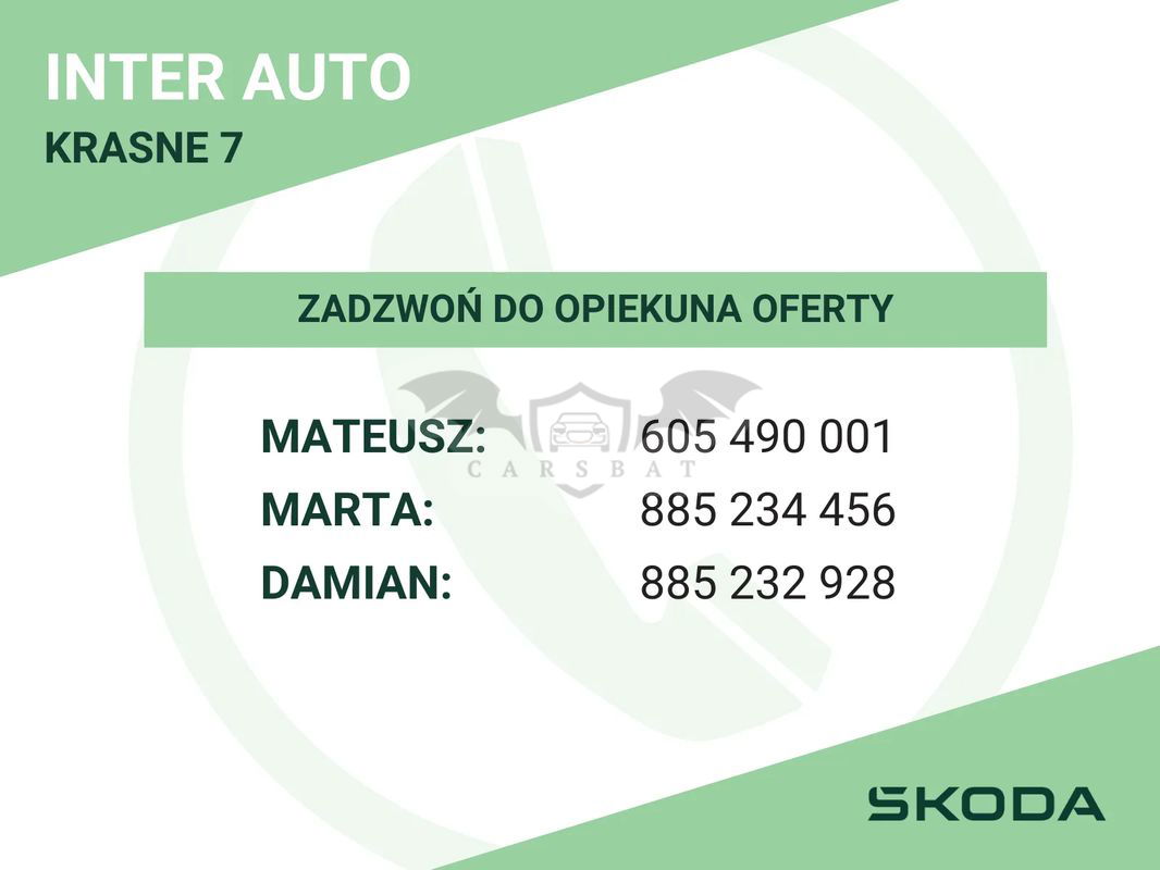 Cena katalogowa tego egzemplarza 201 900 zł Škoda Nowy Superb Selection Silnik: 2.0 TDI 110 kW (150 KM) Kolor: Szary Graphite Metalizowany (F0F0) Rok produkcji: 2024 Wersja wyposażenia: Selection W ofercie posiadamy również inne wersje kolorystyczne, wyposażeniowe i silnikowe. O szczegóły zapytaj sprzedawce. Wyposażenie dodatkowe zawarte w cenie: Stalowe koło zapasowe (PJB) Pakiet Light and view (PL0): Tylne światła TOP LED z dynamicznymi kierunkowskazami Reflektory Full LED Matrix Pakiet Assisted Drive Basic (PR0): Adaptive Cruise Control Adaptive Lane Assist + Emergency Assist + Traffic Jam Assist Wyposażenie standardowe: 8 głośników Acoustic package wraz z Sunset (dźwiękochłonne szyby boczne przednie i tylne) Alarm z funkcją monitorowania wnętrza, czujnikiem przechyłu Asystent skrętu Asystent świateł drogowych Boczne poduszki bezpieczeństwa - przód, poduszka czołowa Climatronic - klimatyzacja automatyczna 3-strefowa Czujniki parkowania - przód i tył DAB+ Funkcja odbioru programów radiowych w formie cyfrowej Design Selection Loft Driver Attension and Drowsiness - zaawansowany system monitorowania uwagi i senności kierowcy Front Assist - kontrola odstępu z funkcją awaryjnego hamowania Funkcja rozpoznawania znaków drogowych Hill Hold Control - system wspomagania ruszania pod wzniesienia Infotainment 10" Kamera cofania Kamera wielofunkcyjna Kessy Full – bezkluczykowy system obsługi samochodu (z funkcją Safe) Lane Assist Poduszka powietrzna dla kierowcy i pasażera z funkcją dezaktywacji czołowej poduszki pasażera, poduszka chroniąca kolana kierowcy Proaktywna ochrona pasażerów Rozszerzone i proaktywne środki ochrony pieszych Side Assist - funkcja monitorowania martwego pola z Rear Traffic Alert oraz Exit Warning Smartlink - przewodowe i bezprzewodowe połączenie z aplikacjami System Start-Stop TPM - system kontroli ciśnienia w oponach Virtual Cockpit - cyfrowy zestaw wskaźników Bezprzewodowa szybka ładowarka indukcyjna Dywaniki tekstylne (dwa z przodu i dwa z tyłu) Elektryczne dogrzewanie powietrza Fotele standardowe Funkcja podstawowego masażu w fotelach przednich Lusterko wsteczne automatycznie przyciemniane Manualne ustawienie wysokości foteli przednich, z możliwością pochylenia siedziska i regulacją głębokości oraz elektrycznym ustawieniem oparcia Osłona przeciwsłoneczna z podświetlanym lusterkiem po stronie kierowcy i pasażera Oświetlenie przestrzeni wokół nóg z przodu i z tyłu Pneumatyczna regulacja w odcinku lędźwiowym foteli przednich Podgrzewane fotele przednie Siatka w przestrzeni bagażowej Skórzana kierownica wielofunkcyjna z łopatkami do zmiany przełożeń Tylna kanapa niedzielona, oparcie dzielone z centralnym podłokietnikiem Uchwyty Isofix na zewnętrznych miejscach z tyłu oraz na fotelu pasażera z przodu Zagłówki dla tylnej kanapy (3 sztuki) Zestaw naprawczy do opon Zestaw narzędzi Bezdotykowo otwierana pokrywa bagażnika Elektrycznie sterowane i składane, podgrzewane lusterka boczne Listwy wokół szyb bocznych w kolorze chromu Obręcze kół ze stopów lekkich 7,5J x 17" Mintaka, srebrne Opony o obniżonym oporze toczenia 215/55 R17 94V Przygotowanie pod hak holowniczy Reflektory główne LED Regulacja zasięgu reflektorów Standardowa tylna rura wydechowa Standardowe śruby do kół Tylne światła w technologii LED Promocyjny leasing lub kredyt! O szczegóły zapytaj sprzedawcę. ▬▬▬▬▬▬▬▬▬▬▬▬▬▬▬▬▬▬▬▬▬▬▬▬▬ Niniejsze ogłoszenie jest wyłącznie informacją handlową i nie stanowi oferty w myśl art. 66, § 1. Kodeksu Cywilnego. Sprzedający nie odpowiada za ewentualne błędy lub nieaktualność ogłoszenia