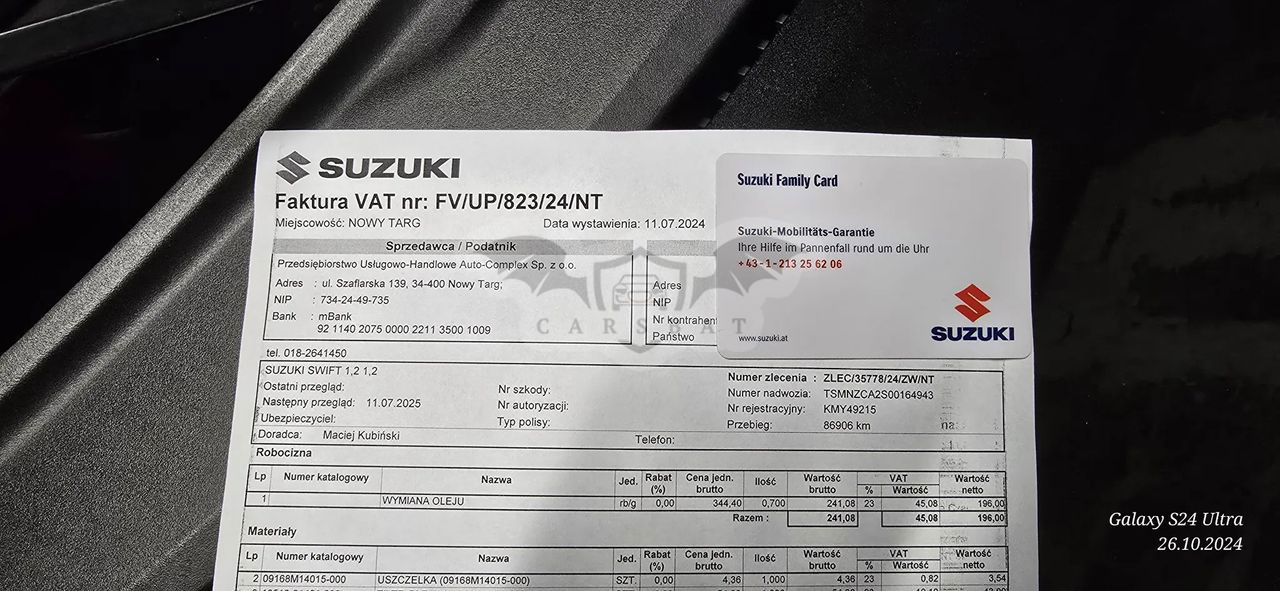 Witam Do mam do sprzedania Suzuki Swift mk7 z bardzo ekonomicznym silnikiem 1,2 na łańcuszku rozrządu. Spalanie w okolicach 5l/100 Swift ma niski udokumentowany przebieg 93tys km. Potwierdzony książka serwisowa. Ostatnio wpis w lipcu 2024 i wtedy też była wymiana oleju. Samochód technicznie w bardzo dobrym stanie. Olej I filtry wymienione przy przebiegu 86tys. (Faktura z aso suzki) z przodu są nowe tarcze oraz klocki hamulcowe. Dodatkowo samochod posiada przyciemnione tylne szyby, czujniki parkowania oraz kamerę cofania. W zawieszeniu i innych podzespołach nie słychać żadnych niepokojących odgłosów. Opłaty ważne do czerwca 2025