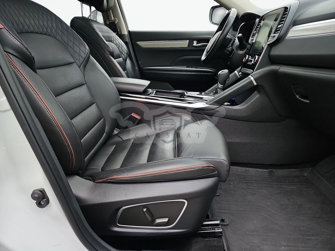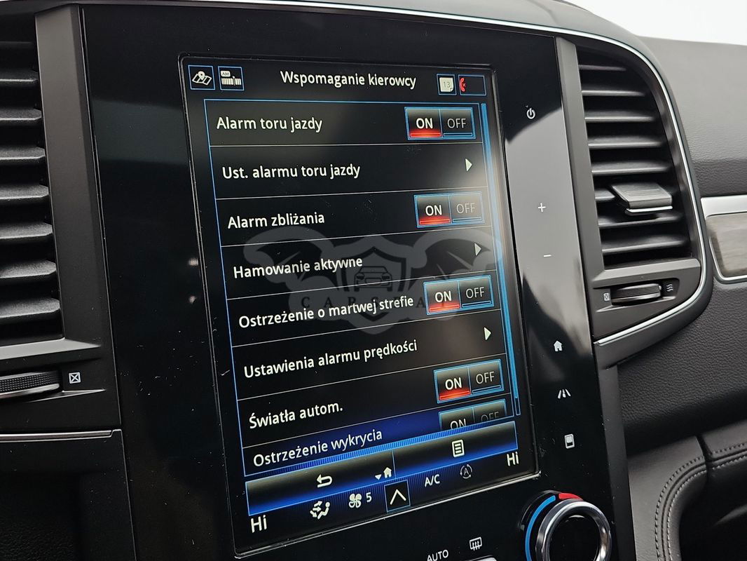 poduszki powietrzne boczne i kurtynowe system ABS aktywny system wspomagania nagłego hamowania, z funkcją wykrywania pieszych (AEBS) system wspomagania nagłego hamowania AFU przednie poduszki powietrzne kierowcy i pasażera możliwość ręcznej dezaktywacji poduszki powietrznej pasażera z przodu sygnalizacja niezapięcia pasów bezpieczeństwa system ostrzegania o nadmiernej prędkości z funkcją rozpoznawania znaków drogowych (OSP/TSR) przednie pasy bezpieczeństwa z regulacją wysokości tylne pasy bezpieczeństwa system kontroli ciśnienia w oponach system kontroli toru jazdy ESC z systemem wspomagania przy ruszaniu pod górę system mocowania fotelika dla dziecka Isofix na tylnych bocznych miejscach system wykrywania zmęczenia kierowcy (UTA) koło zapasowe dojazdowe nawiewy na tylne siedzenia 3 zagłówki tylne zagłówki przednie typu relaks klimatyzacja automatyczna, dwustrefowa centralny zamek konsola centralna z przesuwanym podłokietnikiem tapicerka skórzana nappa czarna oświetlenie wnętrza ambiente elektrycznie i bezdotykowo otwierana klapa bagażnika spryskiwacze reflektorów przednich szyby tylne sterowane elektrycznie przednia szyba podgrzewana przednie osłony przeciwsłoneczne podświetlane z lusterkiem podgrzewane fotele przednie i boczne w 2. rzędzie tylne fotele z regulacją pochylenia oparcia i funkcją Easy Break fotele przednie z reg. elektr., funkcją wentylacji, man. reg. dł. siedziska, fotel kier. z masażem karta Renault Hands Free zespół zegarów i wskaźników z kolorowym 7" ekranem TFT skórzana kierownica z regulacją wysokości i głębokości podgrzewana kierownica pakiet zimowy dach panoramiczny elektrycznie otwierany w części przedniej funkcja automatycznej zmiany świateł drogowych na mijania (AHL) wskaźnik zmiany biegów system kontroli martwego pola (BSW) system ostrzegania o kolizji (FCW) system kontroli pasa ruchu (LDW) system kontroli bezpiecznej odległości (DW) automatyczny hamulec postojowy, elektromechaniczny system wspomagania parkowania easy park assist kamera cofania aktywny regulator prędkości (ACC) relingi dachowe przednia osłona podwozia felga 19" Initiale Paris szyby boczne klejone i przyciemniane z tyłu mapa Europy system multimedialny r-link 2 z ekranem dotykowym 8,7", z nawigacją i systemem nagłośnienia Bose dostęp do usług online światła do jazdy dziennej led światła przednie full led pure vision światła przeciwmgłowe LED elektrycznie regulowane i składane, podgrzewane lusterka boczne z pamięcią i indeksacją elektrochromatyczne lusterko wewnętrze