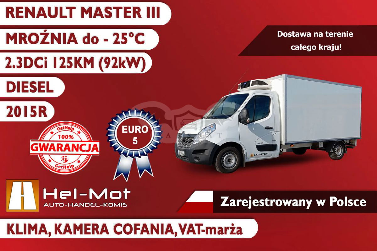 Renault Master III Typ: Chłodnia/ Izoterma Rodzaj: Mroźnia do -25°C Rok produkcji: 2015r Rodzaj paliwa: Diesel Przebieg: 190 283km Pojemność: 2299ccm Skrzynia biegów: Manualna Moc: 125KM Liczba drzwi: 2/3 Liczba miejsc: 3 Rozmiar przestrzeni ładunkowej: 370cm x 200cm x 185cm Status: Sprowadzony ze Szwecji, opłacony i zarejestrowany w Polsce! Numer rejestracyjny: CSE28P3 Nr VIN: VF1VBU4S253504185 Data pierwszej rejestracji: 26.11.2015 Data pierwszej rejestracji w Polsce: 24.02.2024 Data ważności badania technicznego: 27.02.2025 Data ważności Ubezpieczenia OC: 24.10.2024 (Komisowe) Uwaga! Oryginalny przebieg: 190 283km, dowodem jest możliwość sprawdzenia w darmowym raporcie po numerze rejestracyjnym NUA 450, na szwedzkiej stronie Transport Styrelsen se, w zakładce Fordonsuppgifter. Licznik został wymieniony z powodu awarii obrotomierza oraz podświetlenia licznika. Chłodnia ma możliwość podłączenia prądu do agregatu z gniazdka 230V. We Wrześniu bieżącego roku, wykonany serwis mroźni w firmie Apex-Thermo King Sp. z o.o., został wymieniony falownik oraz agregat, na naprawę jest gwarancja. Zostało wykonane: - Serwis mroźni - Wymieniony filtr oleju - Wymieniony olej silnikowy - Wymieniony filtr paliwa - Wymieniony powietrza - Wymieniony filtr kabiny - Komplet opon 4szt. - Wymienione tarcze hamulcowe przednie wraz z klocakmi W przeciwieństwie do większości firm zajmujących się sprzedażą pojazdów używanych nasze pojazdy są ubezpieczone i zarejestrowane w Polsce co umożliwia spokojny i bezpieczny powrót autem "na kołach". MOŻLIWOŚĆ ZAKUPU AUTA NA KREDYT! KUPUJĄCY ZWOLNIONY Z OPŁATY SKARBOWEJ! DOSTAWA NA TERENIE CAŁEGO KRAJU! Wyposażenie dodatkowe: Wnętrze: - Elektryczne szyby przednie - Elektryczne lusterka - Welurowa tapicerka - Centralny zamek - Wspomaganie kierownicy Multimedia: - Radio Oryginalne - MP3 - Komputer pokładowy - Kamera cofania Ogrzewanie i wentylacja - Klimatyzacja manualna Bezpieczeństwo: - Czołowe poduszki powietrzne kierowcy i pasażera - Poduszki powietrzne boczne - System ABS - System ASR - System ESP Inne: - Tempomat Istnieje możliwość dokupienia gwarancji, oraz zakupu na kredyt, szczegóły poniżej. Więcej informacji udzielę telefonicznie. Informacje o gwarancji firmy GetHelp: Do każdego oferowanego auta gwarancja Gethelp na rok, która zapewni: - bezpieczeństwo- gwarant daje dostęp do aplikacji mobilnej do zgłaszania awarii całodobowo - spokój- pomoc przy naprawach na drodze lub przy holowaniu - oszczędność -nie martwisz się kosztami napraw i części- GetHelp płaci - wygodę- w razie awarii auto zastępcze na czas naprawy - możliwość rozszerzenia gwarancji o np. wtryski, klimatyzację, układ chłodzenia, koło dwu-masowe itp GetHelp to największa firma gwarancyjna, która ma 5 gwiazdek na Facebooku i cieszy się uznaniem Partnerów i Klientów. Informację o kredycie: - Dostępne dla zainteresowanych, przed zakupem konieczna weryfikacja zdolności kredytowej kupującego.
