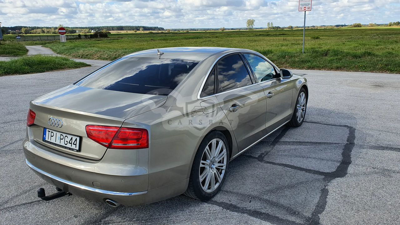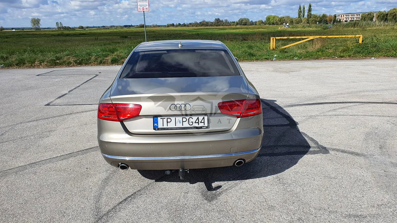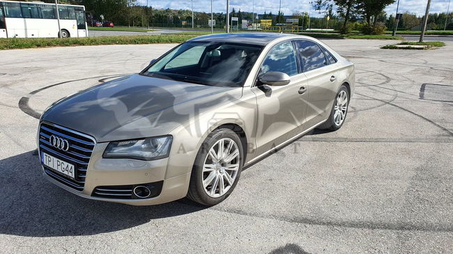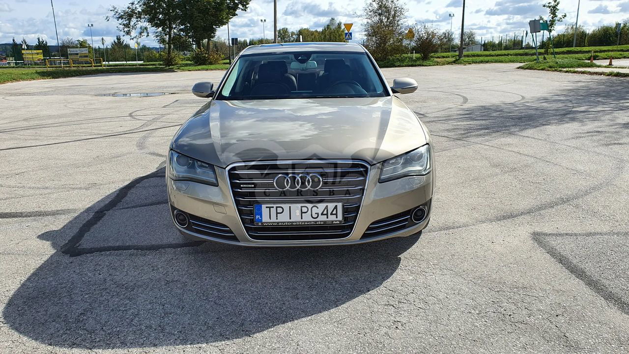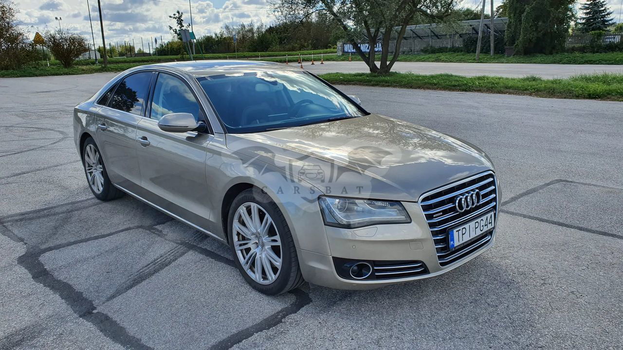 Audi A8 D4 Poj 4.2 TDI 350KM V8 Skrzynia automatyczna 8 - biegowa Napęd Quattro Przebieg 337 tys km Samochód bardzo bogato wyposażony, w najładniejszym zestawieniu z palety Audi: Kolor z najdroższej palety Impala beige metallic, drewno z serii exclusive, brązowe skóry, Samochód kupiony w Polskim salonie - 3 właściciel Samochód w dobrym stanie wizualnym jak i technicznym. Wnętrze samochodu w stanie bardzo dobrym - zadbane, czyste. Samochód bezwypadkowy. Bogate wyposażenie m.in - pneumatyczne zawieszenie - radary, utrzymanie pasa ruchu - aktywny tempomat - noktowizor - automatyczne światła , czujnik zmierzchu - masaże przednich foteli - przednie fotele w pełni elektryczne - podgrzewane i wentylowane - piękna brązowa skórzana tapicerka - piękne wykończenia w drewnie - orzech - el. roleta tylne i tylne boczne - el szyberdach - oświetlenie ambiente - czujniki parkowania przód tył - kamera cofania - nagłośnienie Bang & Olufsen - CD, DVD, Aux - nawigacja - telefon - bluetooth - wielofunkcyjna skórzana kierownica - czujniki martwego pola - klimatyzacja 4 strefowa - key less - dostęp i odpalanie samochodu bez kluczykowy - poziomo i pionowo regulowana kierownica - webasto - tiptronic - dociągi drzwi - pełnowymiarowe aluminiowe koło zapasowe - hak Wady; - mechanizm wyświetlacza MMI uszkodzony do naprawy - szkoda parkingowa - delikatnie zarysowany tylny zderzak Auto godne polecenia w tej cenie. Cena 59900zł do małej negocjacji. Silnik pracuje idealnie, ma moc i ciąg. itd. więcej informacji na telefon 60*******62 sześć zero dwa zero osiem pięć osiem sześć dwa
