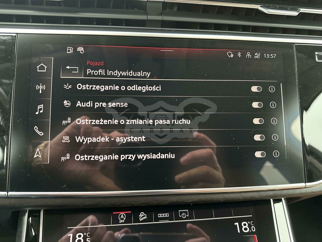 Gwarancja: 2026-07-06 / 150 000km Pojazd do sprzedania tylko z promocyjnym finansowaniem VW Leasing / VW Kredyt Wyposażenie 2-gi rząd siedzeń z regulacją wzdłużną, Adaptacyjny asystent jazdy z asystentem niebezpieczeństwa, Aplikacje dekoracyjne dąb szary naturalny, Audi phone box, Audi side assist z Audi pre sense rear - system ostrzegania o pojazdach w martwym polu lusterka, Elektryczne wspomaganie domykania drzwi, Felgi aluminiowe 20 (5-ramienne) z ogumieniem 285/45, Fotele konturowe z przodu, Fotele przednie podgrzewane, Fotele z przodu z funkcją wentylacji i masażu Hak holowniczy elektrycznie wysuwany, Kierownica 3-ramienna wielofunkcyjna plus, skórzana, Klimatyzacja automatyczna - 4-strefowa, Kluczyk komfortowy z alarmem antywłamaniowym, Lampy przednie HD Matrix LED z dynamicznymi kierunkowskazami i spryskiwaczami, Odtwarzacz DVD, Pakiet Czerń wraz z pierścieniami Audi w kolorze czarnym → [Listwy ozdobne wokół szyb, czarne, Relingi dachowe - czarne, Singleframe (obramowanie chłodnicy) z czarnymi akcentami, Pierścienie Audi w kolorze czarnym, Elementy ozdobne na zderzakach w kolorze czarnym], Pakiet oświetlenia konturowego Ambiente, wielokolorowy → [Dodatkowe oświeltenie wnętrza, 30 kolorów], Podłokietnik przedni, komfortowy z uchwytami na napoje, Przystosowanie do montażu fotelika ISOFIX - na fotelu pasażera, Rezygnacja z oznaczenia modelu i mocy/technologii, System nagłośnienia Bose Surround Sound z dźwiękiem 3D (19 głośników), Szyby tylne przyciemnione (szyby privacy), Tapicerka skórzana Valcona/Cricket, perforowana, Uchwyty ISOFIX do instalacji fotelika dziecięcego, przód, Wzmocnienie odbioru LTE, Zagłówki dla przednich foteli, komfortowe System rozpoznawania znaków drogowych z kamera Kamera cofania Audi smartphone interface quattro (z samoblokujacym srodkowym mechanizmem róznicowym) Audi virtual cockpit 12,3" Adaptacyjny tempomat Asystent parkowania plus 4-kierunkowa regulacja podparcia odcinka ledzwiowego kregoslupa dla przednich foteli Przednie fotele z elektryczna regulacja z funkcja pamieci dla fotela kierowcy Zawieszenie adaptive air suspension sport _ Kontakty do doradców Audi Select :plus: ☎️ +48 Marcin Krakowiak ☎️ +48 Maciej Olszewski Niniejsze ogłoszenie nie stanowi oferty w myśl art. 66 § 1 Kodeksu Cywilnego, a jedynie zaproszenie do zawarcia umowy. Nie odpowiadamy za ewentualne błędy w ogłoszeniu.