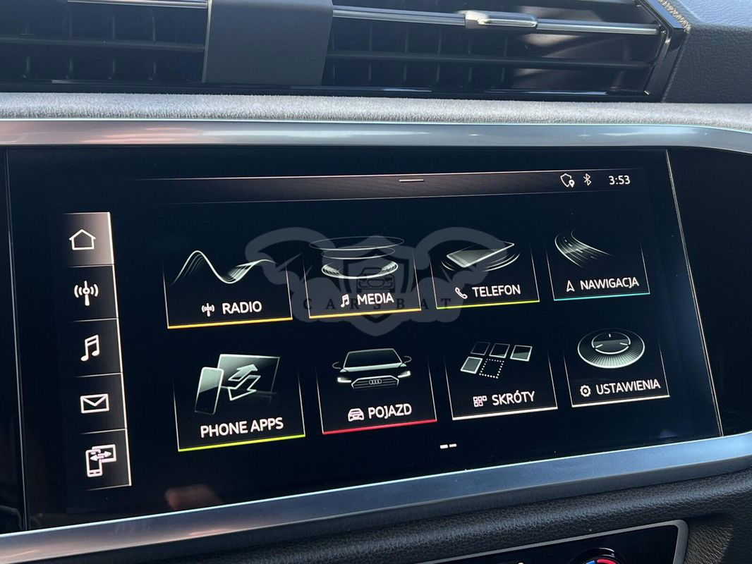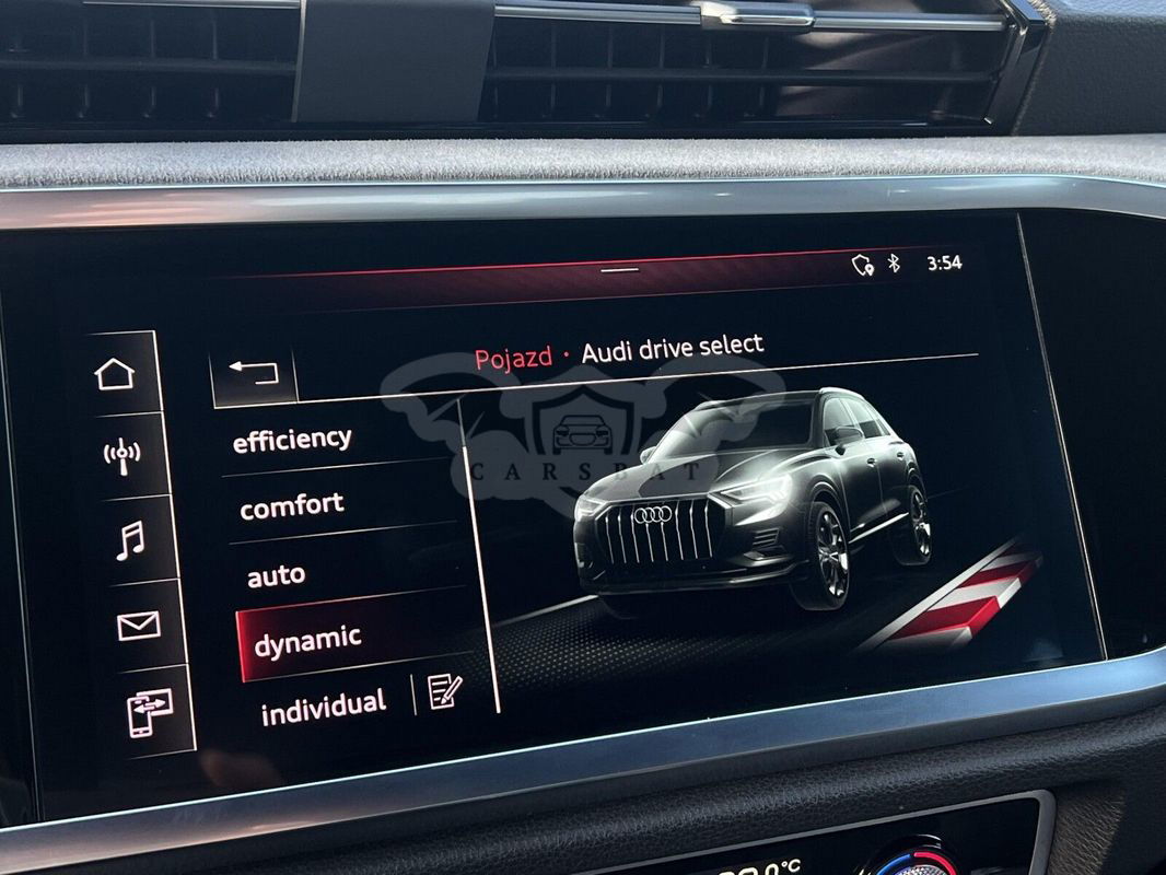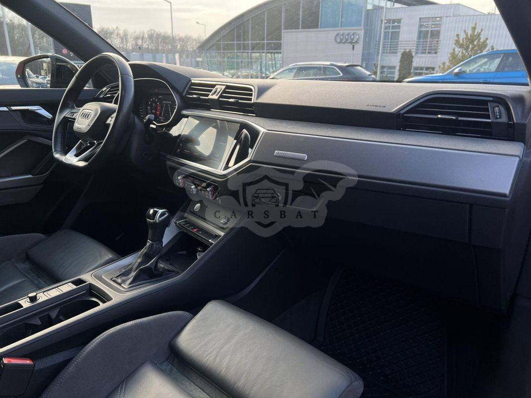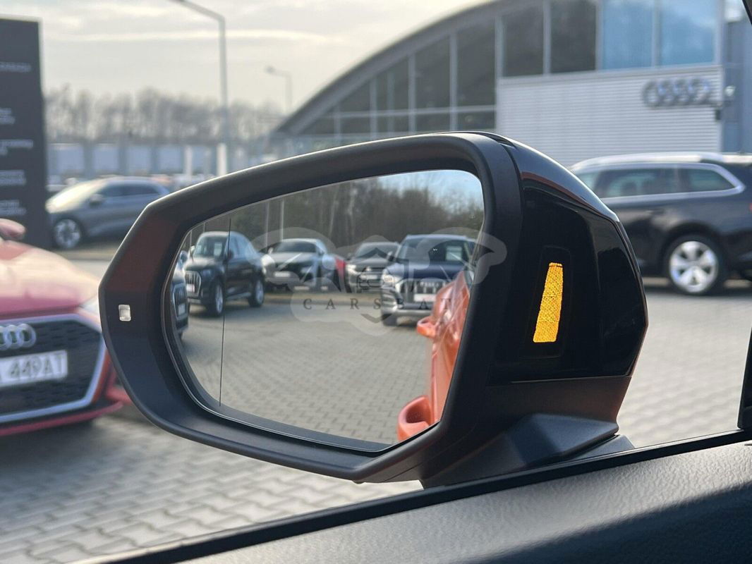 Wyposażenie dodatkowe: Kierownica sportowa wielofunkcyjna skórzana 3-ramienna, na dole spłaszczona Elektroniczny układ stabilizacji toru jazdy ESP Elektromechaniczne wspomaganie kierownicy Przednie fotele regulowane ręcznie Reling dachowy czarny Podgrzewanie foteli przednich Komfortowy klucz Lusterka wewnętrzne z funkcją przeciwoślepieniową Poduszki powietrzne z przodu, system kurtyny powietrznej Podłokietnik środkowy z przodu Obudowy lusterek zewnętrznych w kolorze czarnym Podsufitka z tkaniny w kolorze czarnym Lusterka ustawiana elektrycznie i podgrzewane Alarm antywłamaniowy Tapicerka foteli z Alcantary w kolorze stalowo-szarym Wskaźnik kontroli ciśnienia w oponach System Start-Stop 4-kierunkowa regulacja podparcia lędźwiowego kręgosłupa dla przednich foteli Asystent parkowania plus Reflektory LED Światła do dziennej jazdy LED Czujnik światła/deszczu Tempomat Tylne lampy zespolone LED z dynamicznym kierunkowskazem Automatyczna klimatyzacja Cyfrowe zegary Audi phone box – ładowanie indukcyjne telefonu Asystent podjazdu Asystent ruszania Audi smartphone interface - zrzut ekranu smartfona na wyświetlacz centralny za pomocą Apple CarPlay lub Android Auto Felgi aluminiowe odlewane, 20-ramienne w kształcie litery V, Contrast Grey, częściowo polerowane, 7J x 19