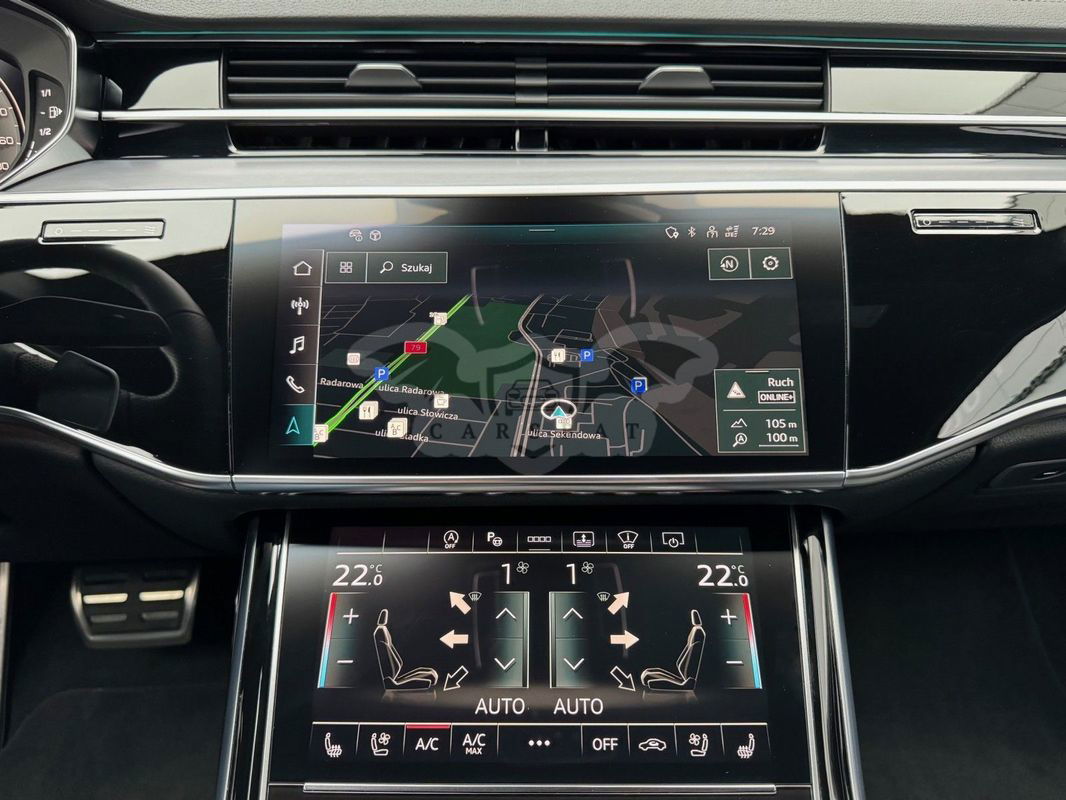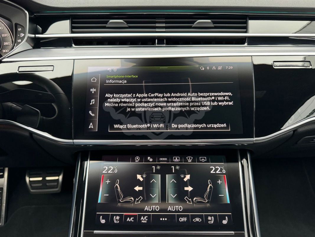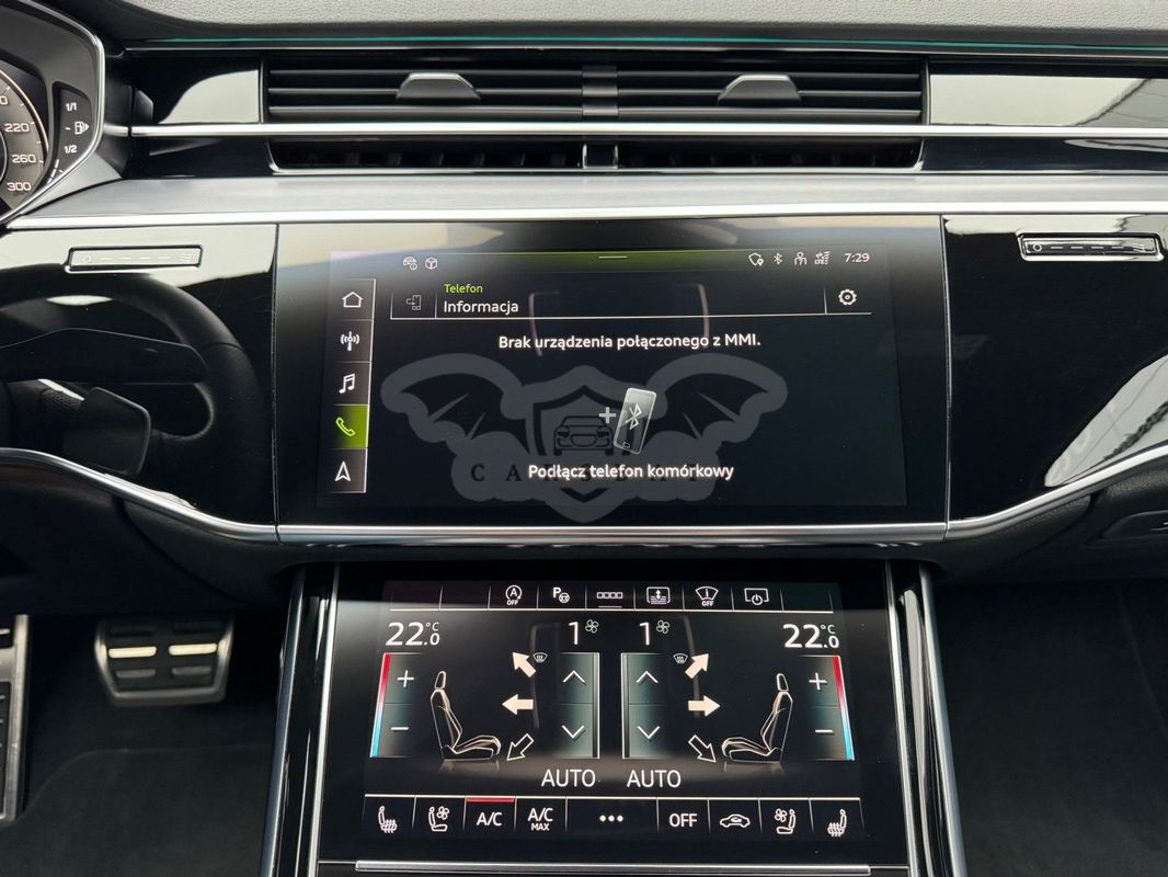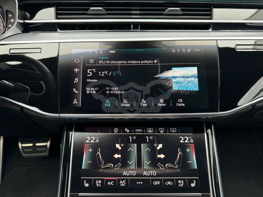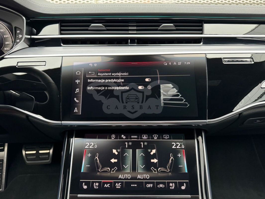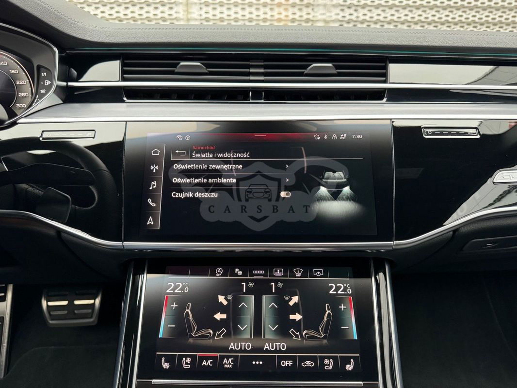 Gwarancja fabryczna producenta do 02.04.2028 / 100 000km Wyposażenie dodatkowe: (9AU) 4-strefowa komfortowa klimatyzacja automatyczna (6I6) Adaptacyjny asystent jazdy z Emergency Assist (8T8) Adaptacyjny tempomat z ogranicznikiem prędkości, asystentem wydajności, (2MA) adaptive air suspension sport (PBY) Assistance package Plus with remote park assist plus (FT1) Asystent parkowania plus (7X5) Asystent parkowania z Audi parking system plus (JX1) Asystent skrzyżowań (7W3) Audi pre sense rear (IU1) Audi smartphone interface (9VS) Bang & Olufsen Premium Sound System z dźwiękiem 3D (QW4) Centralny panel obsługowy z tyłu (PS2) Comfort individual contour seat package in sports look (Q1D)Przednie komfortowe siedzenia konturowe w sportowej stylistyce (6XL)Lusterka zewnętrzne elektrycznie regulowane, ogrzewane i składane, oba lusterkaautomatycznie przyciemniane, z funkcją p (3PR)Przednie siedzenia z elektryczną regulacją, z funkcją pamięci ustawień (N1W)Skóra Valcona pikowana w romby (6E3)Podłokietnik komfortowy z przodu (QU1) Cyfrowy odbiór TV bez systemu C+ PayTV i z cyfrowym odbiorem radiowym (PC1) Czarne zaciski hamulców, 17-calowe (ECE) (2ED)Hamulce tarczowe z tyłu, 17-calowe, czarne zaciski hamulców (ECE) (1LL)Hamulce tarczowe z przodu, 17-calowe, czarne zaciski hamulców (ECE) (9WP) Ekrany w tylnej części kabiny (5TL) Górne aplikacje dekoracyjne pokryte czarnym lakierem fortepianowym (1D3) Hak holowniczy (KA6) Kamery obserwujące otoczenie (1XW) Kierownica wielofunkcyjna, 3-ramienna, z przełącznikami zmiany (46A) Obręcze kół ze stopu metali lekkich Audi Sport 9.0Jx20", 5 - ramienne, (6FJ) Obudowy lusterek w kolorze czarnym (9M9) Ogrzewanie postojowe i wentylacja (4ZP) Pakiet optyczny Czerń z czarnymi pierścieniami Audi (PE6) Pakiet pojedynczych siedzeń z tyłu (7P3)4-kierunkowa regulacja podparcia odcinka lędźwiowego kręgosłupa dla siedzeń przednich i skrajnych siedzeń tylnych (4A4)Ogrzewanie przednich i tylnych siedzeń (3Y8)Rolety przeciwsłoneczne tylnej szyby i szyb bocznych z tyłu z elektryczną regulacją (3Q3)Zagłówki komfortowe z tyłu (5KF)3 miejsca siedzące z tyłu z 2 elektrycznie regulowanymi pojedynczymi fotelami (PQD) Pakiet S line Exterieur (2K7)Zderzaki S line (WQS) Pakiet S line Interieur (VT5)Listwy progowe w przednich drzwiach ze wstawkami z aluminium, podświetlane, z logo S (QQ2)Pakiet oświetlenia Ambiente plus (GS5)Przyciski obsługowe czarne z połyskiem,z haptycznym feedbackiem i pakietem wnętrza w optyce aluminium (GT1)Dolne aplikacje dekoracyjne z ciemnego szczotkowanego aluminium (VF1)Pedały oraz podparcie pod lewą nogę ze stali nierdzewnej (6XL)Lusterka zewnętrzne elektrycznie regulowane, ogrzewane i składane, oba lusterkaautomatycznie przyciemniane, (6NQ) Podsufitka tkaninowa w kolorze czarnym (7G1) Preparation for VTS (vehicle tracking system) (GH2) quattro ze sportowym mechanizmem różnicowym (7Y1) System ostrzegający przy zmianie pasa ruchu z ostrzeżeniem przy (QR9) System rozpoznawania znaków drogowych współpracujący z kamerą (QL5) Szyby z dodatkową powłoką zaciemniającą (PDG) Szyby z izolacją termiczną i akustyczną (4GR)Przednia szyba ze szkła z izolacją termiczną i akustyczną, ogrzewana, bez widocznych drucików (4D2) Wentylacja i funkcja masażu dla przednich i tylnych siedzeń (GZ2) Wspomaganie zamykania drzwi (KS1) Wyświetlacz Head-Up (UE8) Złącza USB z funkcją ładowania w tylnejczęści kabiny W naszym salonie zapewniamy również kompleksową obsługę w zakresie finansowania zakupu samochodu i ubezpieczeń komunikacyjnych. Ponadto oferujemy usługę odkupu samochodów używanych. Skupujemy samochody używane wszystkich klas, segmentów, marek i modeli. Transakcji odkupu dokonujemy z osobami fizycznymi, firmami i instytucjami oraz profesjonalistami branży motoryzacyjnej. Niniejsze ogłoszenie jest wyłącznie informacją handlową i nie stanowi oferty w myśl art. 66, § 1. Kodeksu Cywilnego. Sprzedający nie odpowiada za ewentualne błędy lub nieaktualność ogłoszenia.