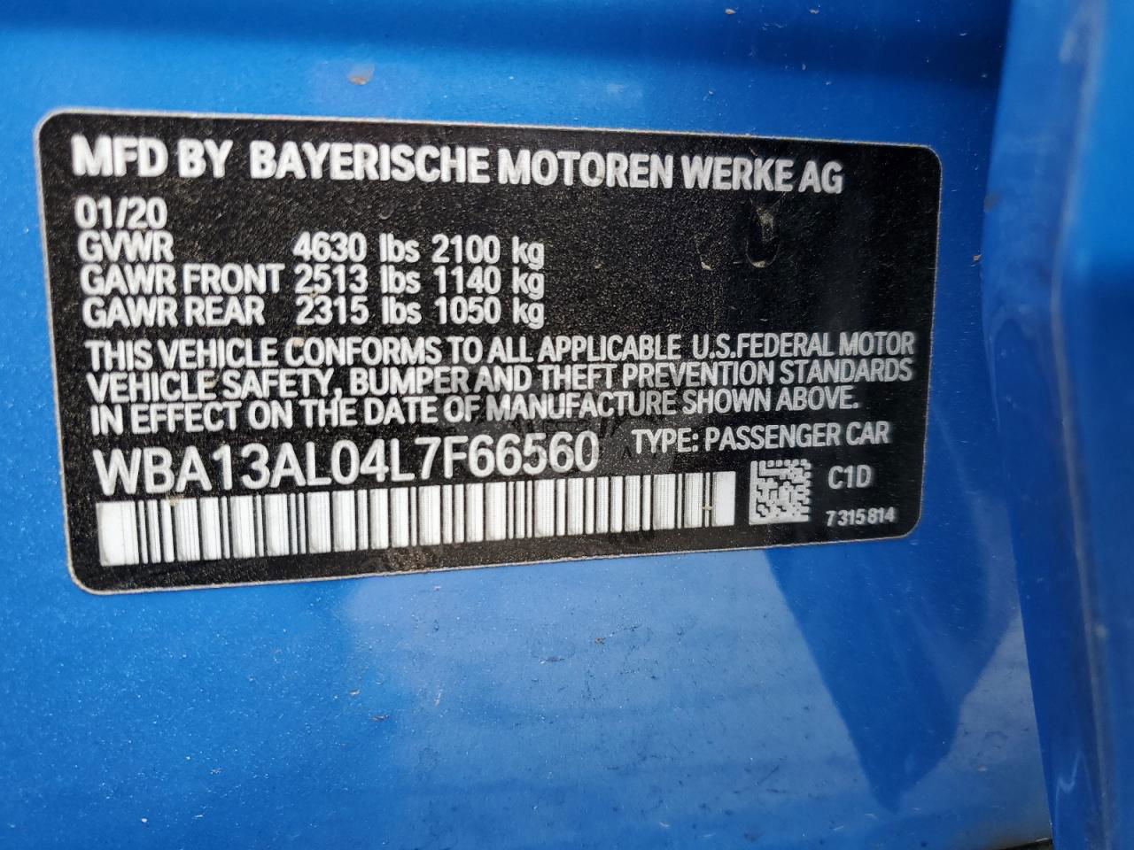• VIN: WBA13AL04L7F66560