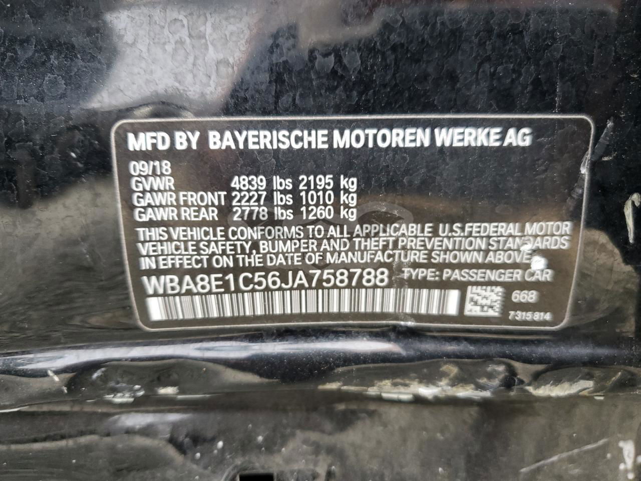• VIN: WBA8E1C56JA758788