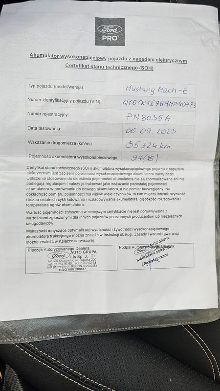 Ford Mustang Mach-E RWD, Silnik Elektryczny Umieszczony na Tylniej Osi, Zwiększony Zasięg - 610 km, Rok Produkcji 2021, Przebieg 70 007 km, Auto Sprawne w 100%, Wnętrze Czyste Nie Nosi Znamion Palenia Papierosów, Auto Pochodzi z Polskiego Salonu, Pełna Dokumentacja, Gwarancja Producenta, Auto Od Pierwszego Właściciela, Bezwypadkowe, Faktura Vat23, To Auto Inspirowane Legendarnym Mustangiem. Wersja z Napędem Na Tylne Koła (RWD) Oferuje Sportowe Osiągi, Nowoczesne Technologie i Przestronne Wnętrze. VIN: WF0TK1E78MMA40473 Auto Posiada: Duży Ekran 15,5 cala z Systemem SYNC 4A Cyfrowy Kokpit 10,2 cala, Elektryczne - Składane, Podgrzewane Lusterka Boczne, Układ Kierowniczy Ze Wspomaganiem Elektrycznym EPAS One Pedal Driving - System Sterowania jednym Pedałem ,FordPass Connect z Modemem GSM: - Zdalne Otwieranie/Zamykanie Zamków Drzwi, - Funkcja Lokalizacji Pojazdu, - Status Systemów Pokładowych, - Informacja o Ruchu Drogowym Przez Kanał GSM, - WIFI HOT SPOT, - Zdalne Uruchamianie Pojazdu, Komputer Pokładowy, Driver Alert - System Monitorowania Koncentracji Kierowcy Ford KeyFree - System Centralnego Zamka z Kluczem Elektronicznym. Umożliwia Otwarcie Drzwi i Uruchomienie Pojazdu Bez Tradycyjnego Kluczyka Klimatyzacja Automatyczna Dwustrefowa,, Podgrzewane Przednie Fotele, Podgrzewana Przednia Szyba, Przednia Szyba z Filtrem Przeciwsłonecznym IR Elektryczna Regulacja Położenia Przednich Foteli w 8. Kierunkach z Funkcją Pamięci Oraz Pamięci Położenia Lusterek Światła Przód i Tył LED z Funkcją Auto High-Beam Wielofunkcyjna Kierownica, Czujniki Parkowania Tył i Przód, Active Park Assist 2 System Kamer 360 Stopni Czujnik Deszczy i Zmierzchu, Ford Co-Pilot360: - Adaptacyjny Tempomat Aktywny, - Asystent Pasa Ruchu, - Automatyczne Hamowanie Awaryjne System Rozpoznawania Znaków Drogowych, System BlueCruise (półautomatyczna jazda) ISOFIX, System ABS z Elektronicznym Układem Sił Hamowania EBD, Elektroniczny Układ Stabilizacji Toru Jazdy ESC z Układem Kontroli ETC, System Monitorowania Ciśnienia w Oponach TPMS Funkcja Trenera Hamowania, Automatyczna Skrzynia Biegów, Zestaw Głośnomówiący Bluetooth Bezprzewodowa Obsługa Apple CarPlay i Android Auto Obręcze Kół Ze Stopów Lekkich, Moc: 294 KM/ 221 KW Klasa Środowiskowa: EURO 6 Liczba Poprzednich Właścicieli : 1 Liczba Kluczyków: 2 Dla klientów Oglądających Ogłoszenie Na Portalu OLX Więcej Zdjęć Na Portalu OTOMOTO. Możliwość Obejrzenia Auta Za Pomocą Wideo Połączenia Dzięki Aplikacji WhatsApp Lub Messenger ( Po Wcześniejszym Umówieniu Się) Możliwość Dostarczenie Auta Pod Adom Klienta ISTNIEJE MOŻLIWOŚĆ SPRAWDZENIA AUTA W AUTORYZOWANEJ STACJI DIAGNOSTYCZNEJ JAK RÓWNIEŻ MOŻLIWOŚĆ JAZDY PRÓBNEJ, AUTO W 100% SPRAWNE. KUPUJĄCY ZWOLNIONY Z OPŁATY SKARBOWEJ CENA AUTA ZAWIERA 6 MIESIĘCZNĄ PISEMNĄ GWARANCJE. CENA Brutto 149 900,00 PLN, Netto: 121 870,00 PLN TELEFON: Mariusz , Szymon
