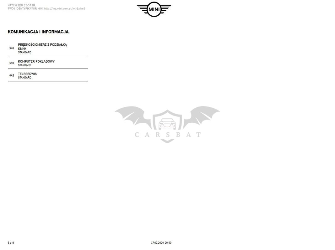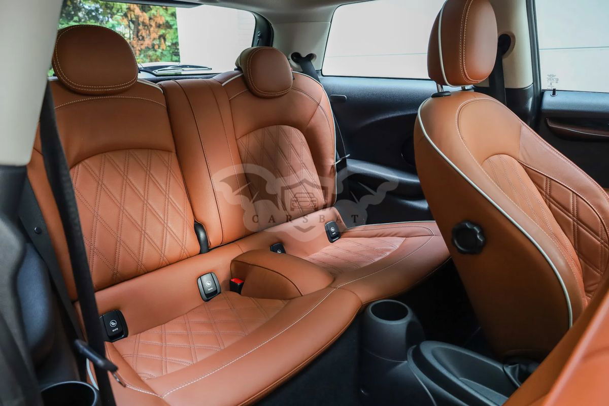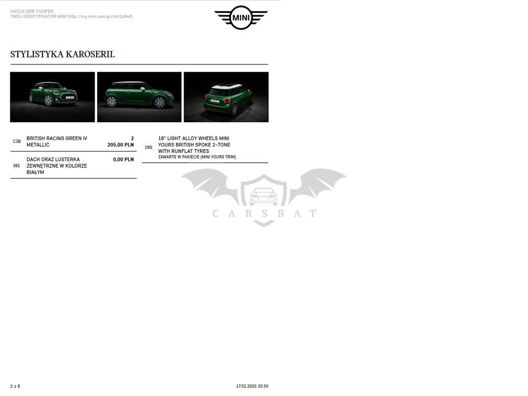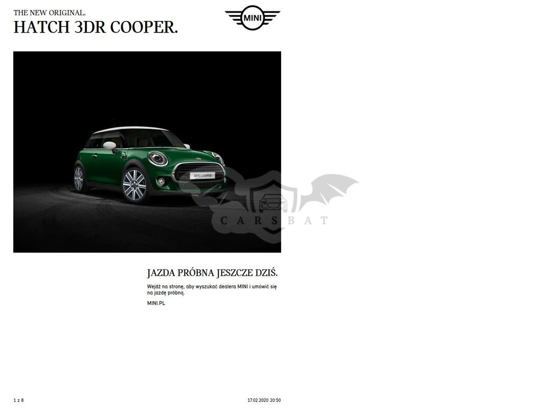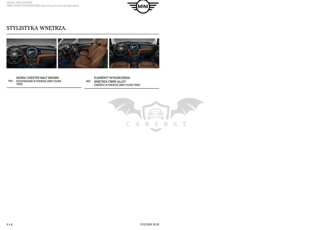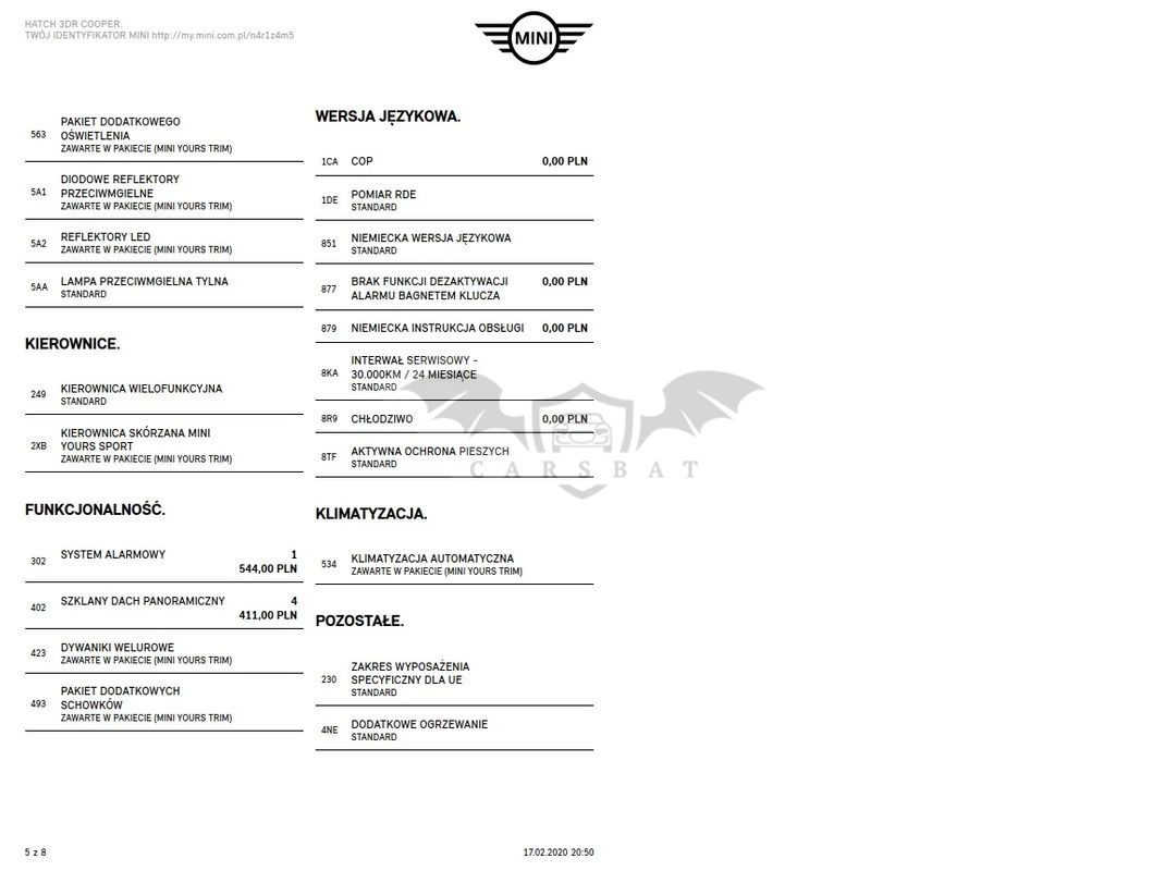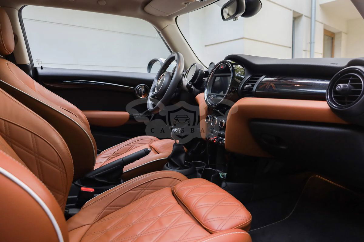 Szklany dach panoramiczny elektrycznie sterowany z roletą – robi różnicę! Latem poczucie jakbyś jechał kabrioletem ;) System alarmowy Dach i lusterka w kolorze białym Wystrój wnętrza Malt Brown Klimatyzacja automatyczna Pakiet dodatkowego oświetlenia (reflektor prezentujący logo MINI przy otwarciu drzwi – świetnie to wygląda Diodowe reflektory przeciwmgielne Reflektory LED Białe lampy kierunkowskazów Tylne lamy UNION JACK (angielska flaga) Radio MINI Visual Boost (centralny panel dotykowy) Computer pokładowy Czujnik deszczu z automatyczną kontrolą Isofix Regulacja wysokości fotela kierowcy i pasażera Dywaniki welurowe z logo MINI Bagażnik dwupoziomowy z przegrodą (podłogą)