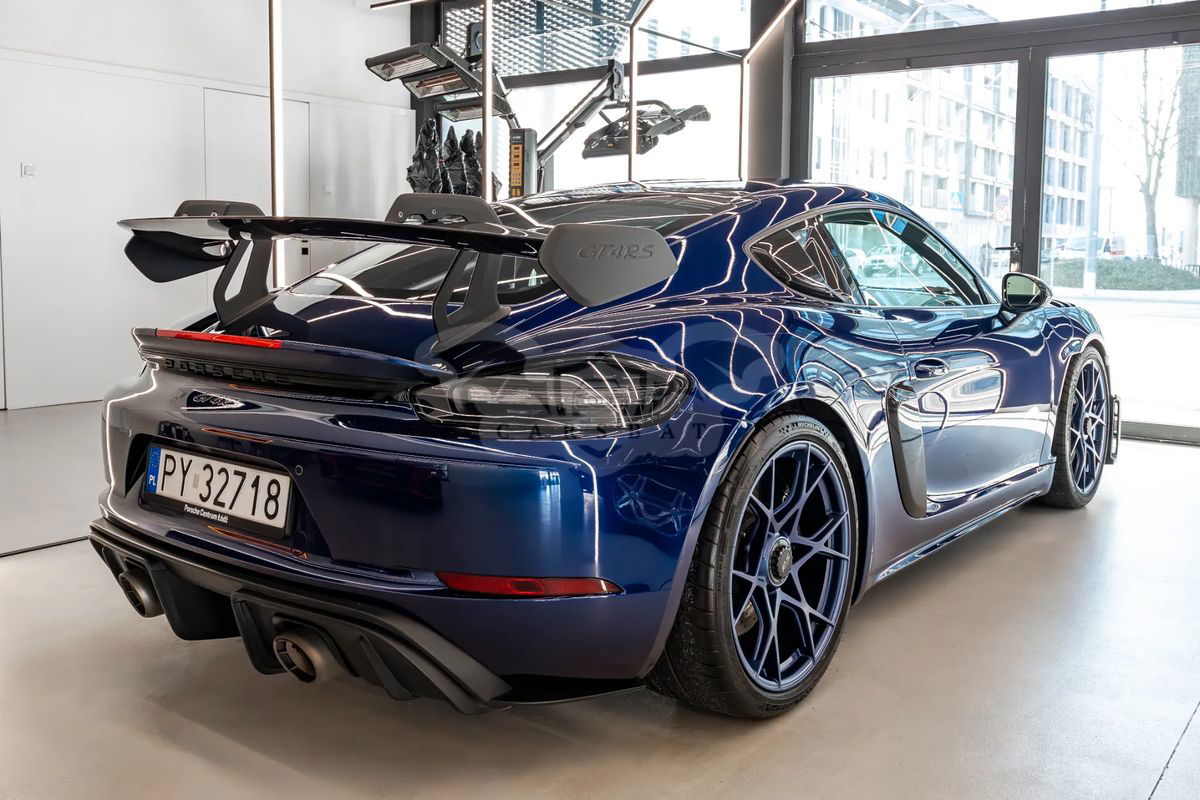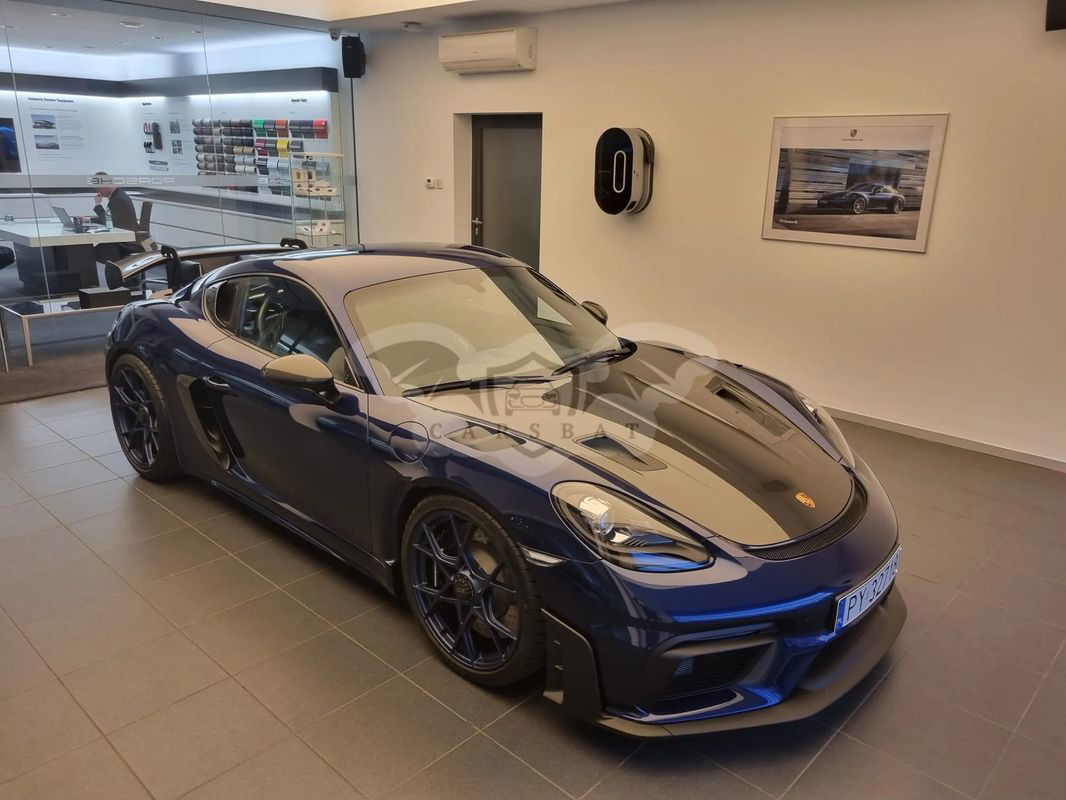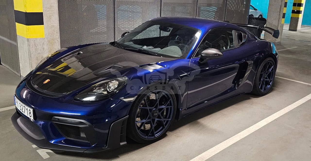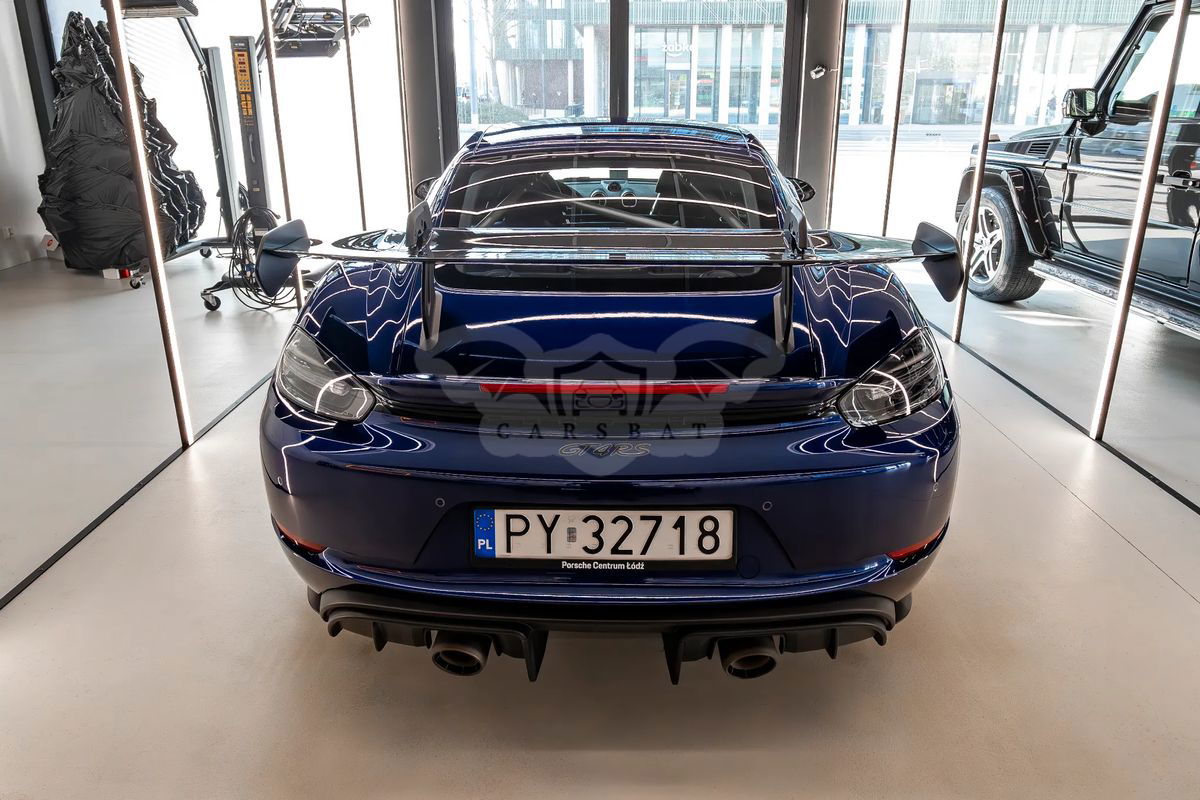 Model: 718 Cayman GT4 RS Rok modelowy: 2023 Moc (kW/KM): 500 KM Pojemność silnika: 3 996 cm³ Prędkość maksymalna 0-100 km/h: 3,4s Skrzynia biegów: Przekładnia Porsche Doppelkupplung (PDK) Gwarancja Porsche Approved do 03/2026 W lutym 2025 roku przeszedł pełny przegląd oraz wymianę opon na nowe, auto w doskonałym stanie technicznym i wizualnym Kontakt do opiekuna auta: +48 Wyposażenie dodatkowe: Kolory nadwozia 1A: Gentian Blue Metallic Kolory wnętrza 62: Wnętrze z pakietem Weissach z rozszerzonym zestawem elementów wykończonych skórą i materiałem Race-Tex, kolory: czarny / Deep Sea Blue P74 : Pakiet Weissach Pakiet Weissach bez klatki bezpieczeństwa Klatka bezpieczeństwa (tytanowa) 003: Pakiet Club Sport P11: Fotele w pełni kubełkowe CSX: Trójkątne narożniki bocznych szyb wykończone włóknem węglowym Porsche Exclusive Manufaktur 250: Przekładnia Porsche Doppelkupplung (PDK) 474: Układ podnoszenia przedniej osi QR5: Pakiet Chrono 082: Zbiornik paliwa o pojemności 90 l XBS: Zaciski hamulcowe lakierowane na kolor czarny (wysoki połysk) Porsche Exclusive Manufaktur 421: 20-calowe obręcze 718 Cayman GT4 RS (kute, z aluminium) 349: Obręcze lakierowane na kolor Indigo Blue 630: Pakiet Light Design P13: Automatycznie przyciemniane lusterka (boczne i wewnętrzne) oraz czujnik deszczu 637: Wspomaganie parkowania ParkAssist (z tyłu) z kamerą cofania 810: Dywaniki podłogowe 563: Pasy bezpieczeństwa w kolorze Deep Sea Blue 509: Gaśnica XXD: Nakładki progów drzwi wykończone włóknem węglowym, podświetlane Porsche Exclusive Manufaktur 9VL: Nagłośnienie BOSE® Surround Sound System Auto do obejrzenia w Poznaniu lub Ostrowie Wielkopolskim.