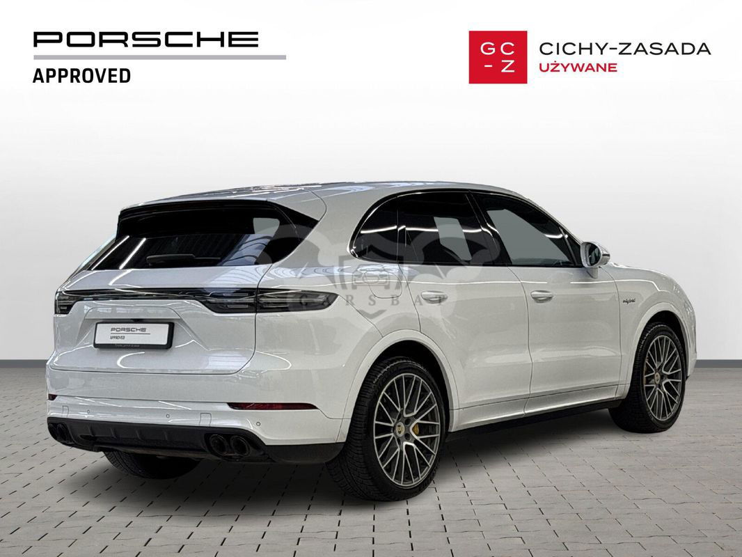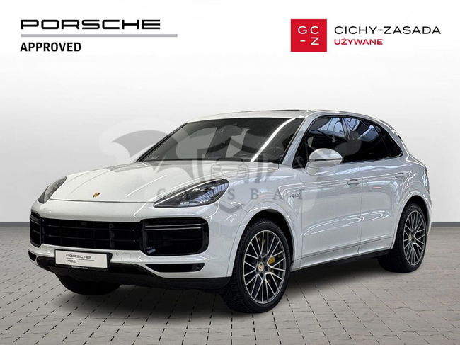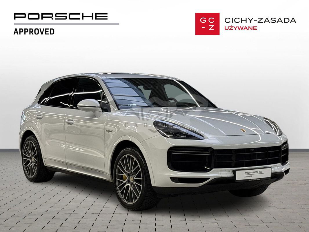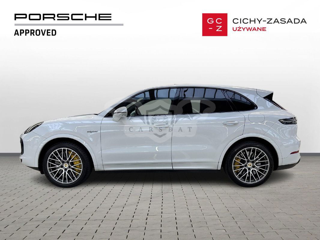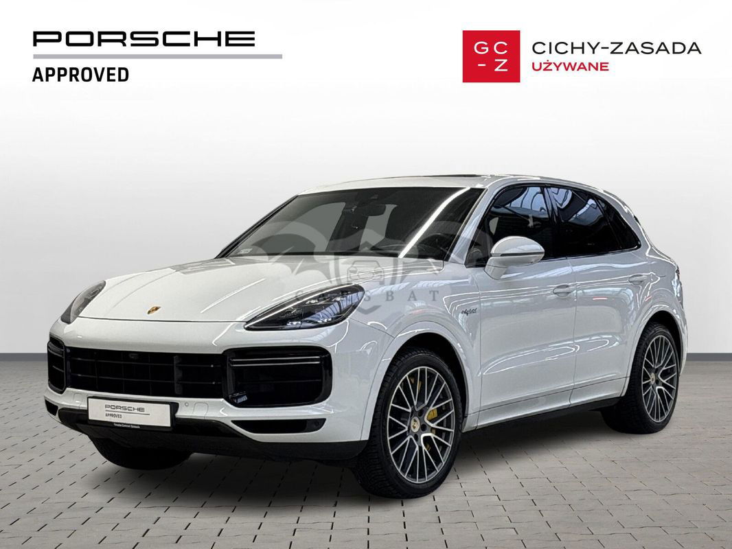 Silnik: V8 4,0 l biturbo + silnik elektryczny. Moc łączna: 680 KM (500 kW). Moment obrotowy: 900 Nm. Przyspieszenie 0–100 km/h: 3,8 s (z pakietem Sport Chrono). Prędkość maksymalna: 295 km/h. Skrzynia biegów: 8-biegowa automatyczna Tiptronic S. Napęd: na wszystkie koła (Porsche Traction Management). Zasięg elektryczny (WLTP): 32 km. Zużycie paliwa (WLTP): 5,0 l/100 km (w cyklu mieszanym). Zużycie energii elektrycznej: 23,7 kWh/100 km. Kolor nadwozia: Carrara White Metallic. Kolor wnętrza: Gładka skóra w kolorze czarnym. Przebieg: 167 400 km. Pierwsza rejestracja: 09/2020. Design, który inspiruje Nadwozie w kolorze Carrara White Metallic w połączeniu z elementami wykończenia w wysokim połysku czerni podkreśla sportowy charakter modelu. 22-calowe obręcze Cayenne Sport Classic w kolorze Jet Black Metallic oraz przyciemniane reflektory LED z Porsche Dynamic Light System Plus (PDLS+) nadają całości wyjątkowego stylu. Wyposażenie podstawowe