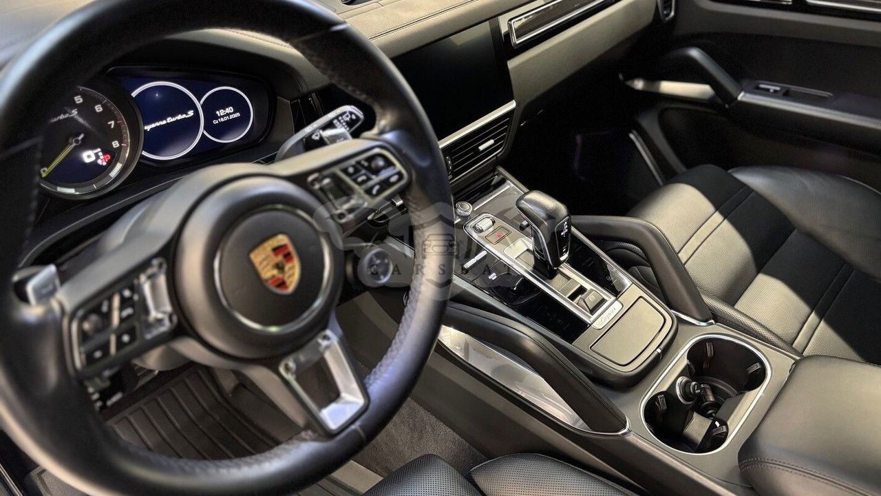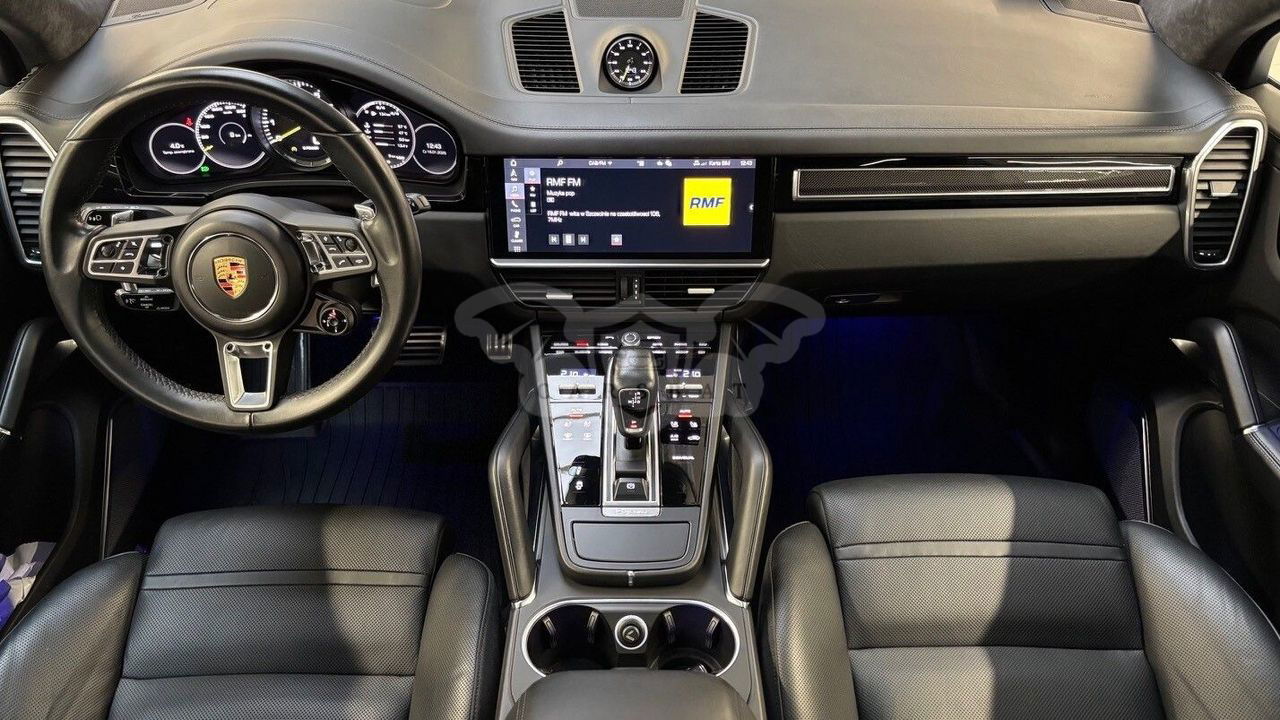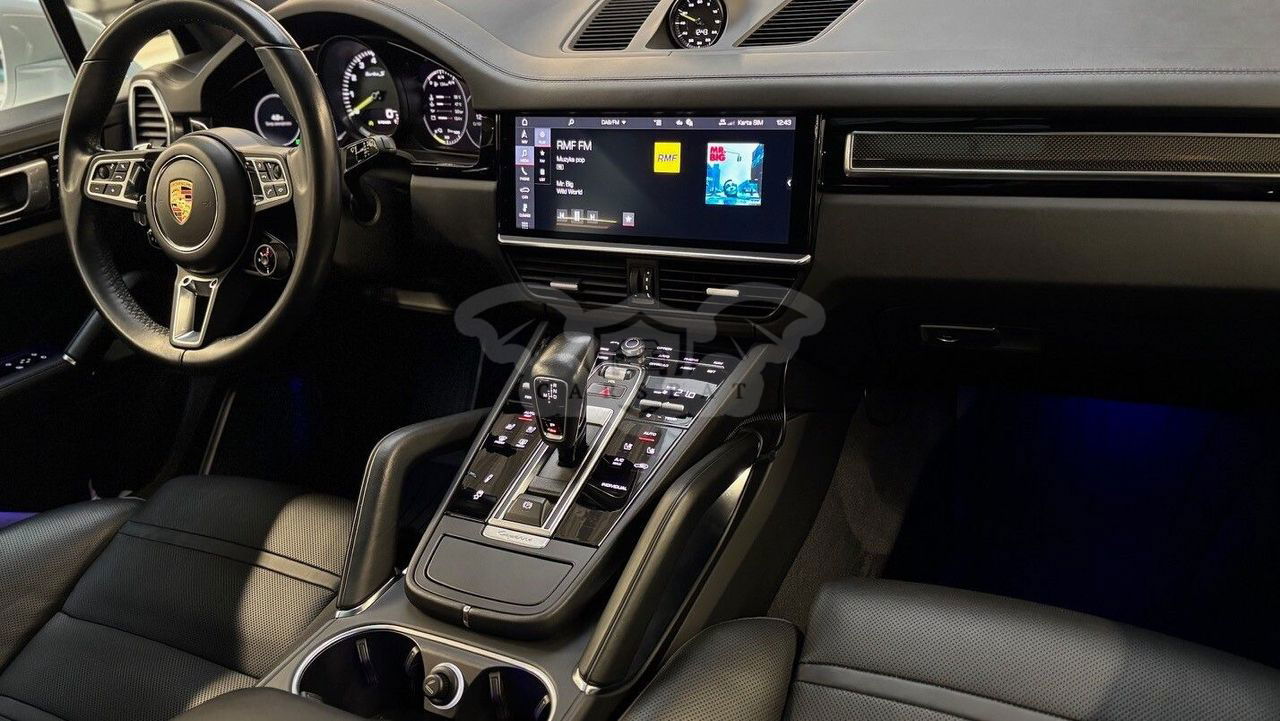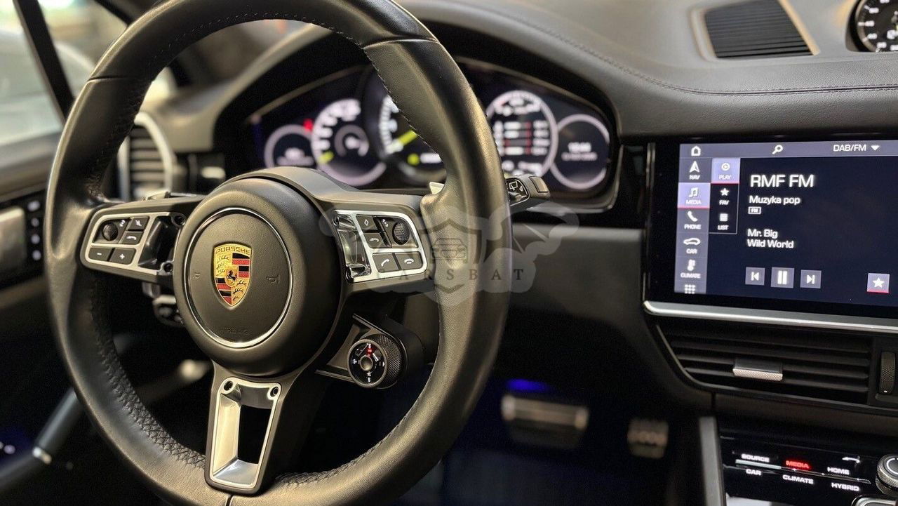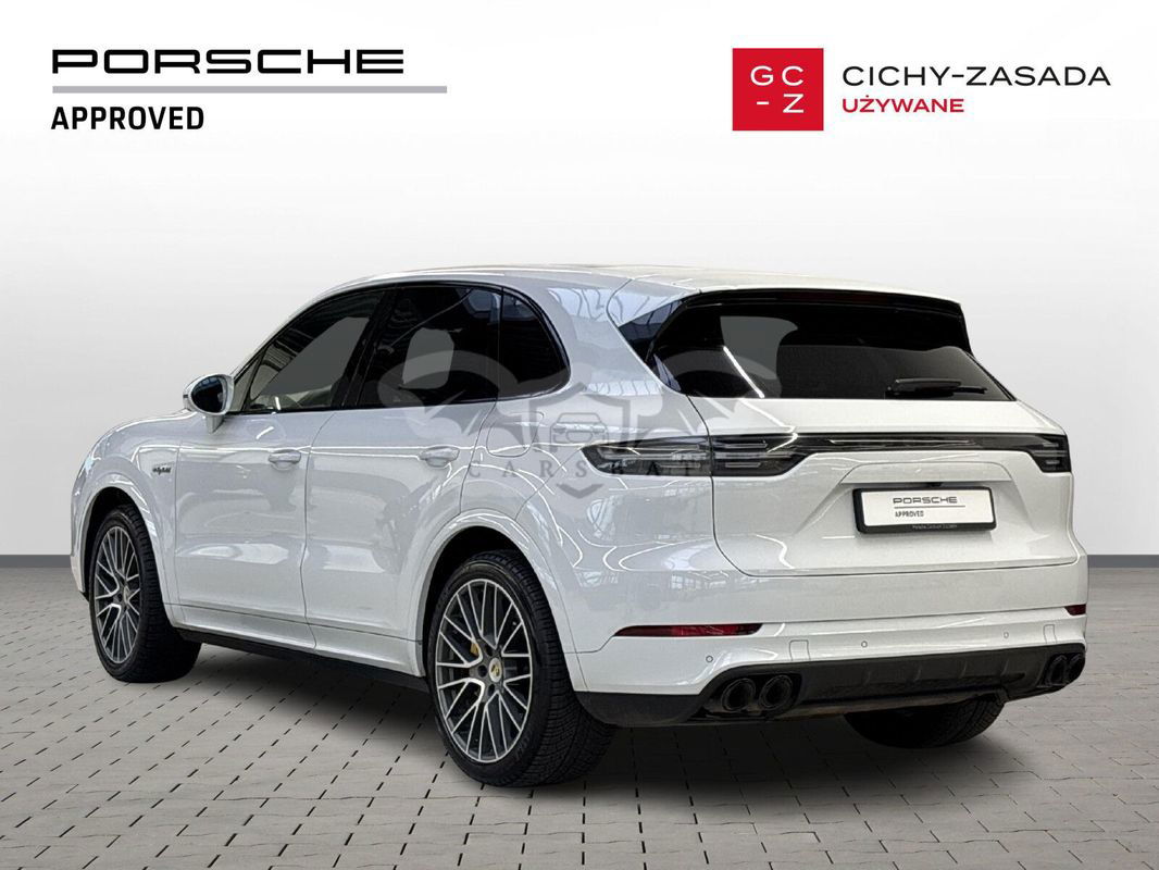 Silnik: V8 4,0 l biturbo + silnik elektryczny. Moc łączna: 680 KM (500 kW). Moment obrotowy: 900 Nm. Przyspieszenie 0–100 km/h: 3,8 s (z pakietem Sport Chrono). Prędkość maksymalna: 295 km/h. Skrzynia biegów: 8-biegowa automatyczna Tiptronic S. Napęd: na wszystkie koła (Porsche Traction Management). Zasięg elektryczny (WLTP): 32 km. Zużycie paliwa (WLTP): 5,0 l/100 km (w cyklu mieszanym). Zużycie energii elektrycznej: 23,7 kWh/100 km. Kolor nadwozia: Carrara White Metallic. Kolor wnętrza: Gładka skóra w kolorze czarnym. Przebieg: 167 400 km. Pierwsza rejestracja: 09/2020. Design, który inspiruje Nadwozie w kolorze Carrara White Metallic w połączeniu z elementami wykończenia w wysokim połysku czerni podkreśla sportowy charakter modelu. 22-calowe obręcze Cayenne Sport Classic w kolorze Jet Black Metallic oraz przyciemniane reflektory LED z Porsche Dynamic Light System Plus (PDLS+) nadają całości wyjątkowego stylu. Wyposażenie podstawowe