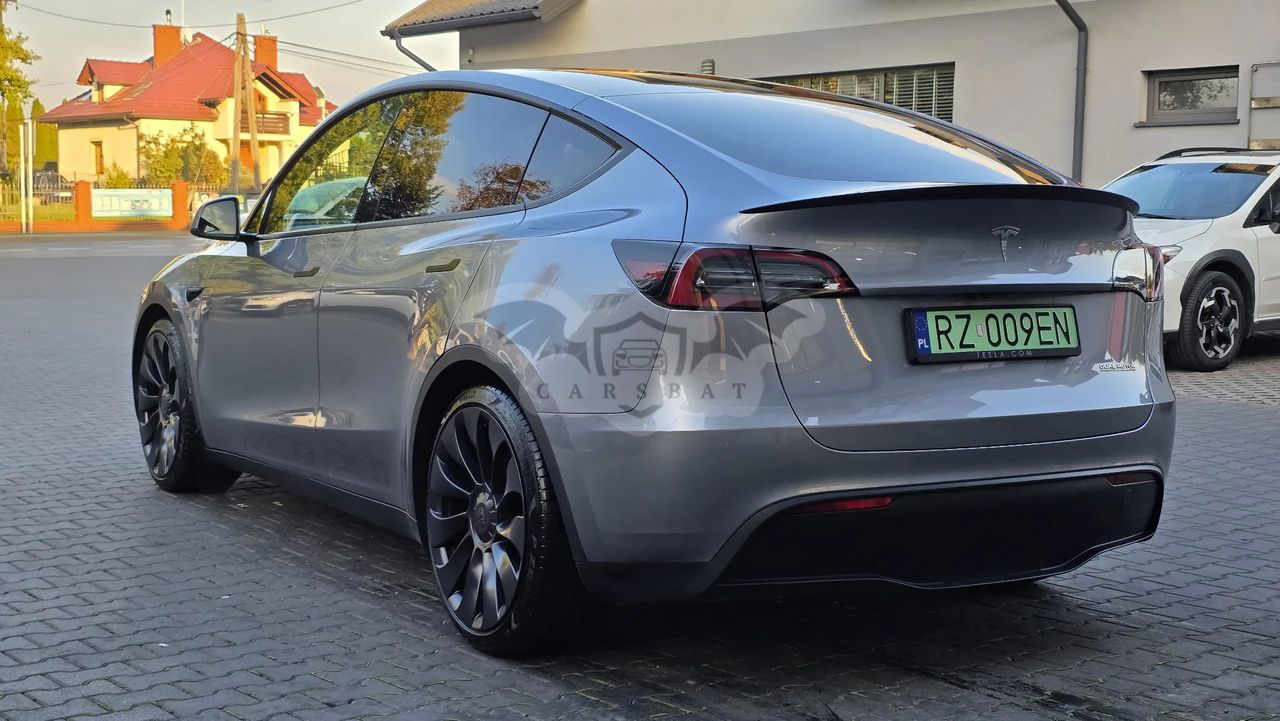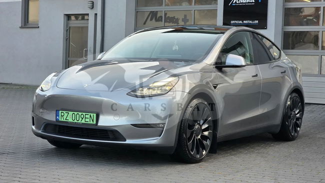 Srebrny Tesla Model Y Performance AWD 2023 roku | Elektryczny